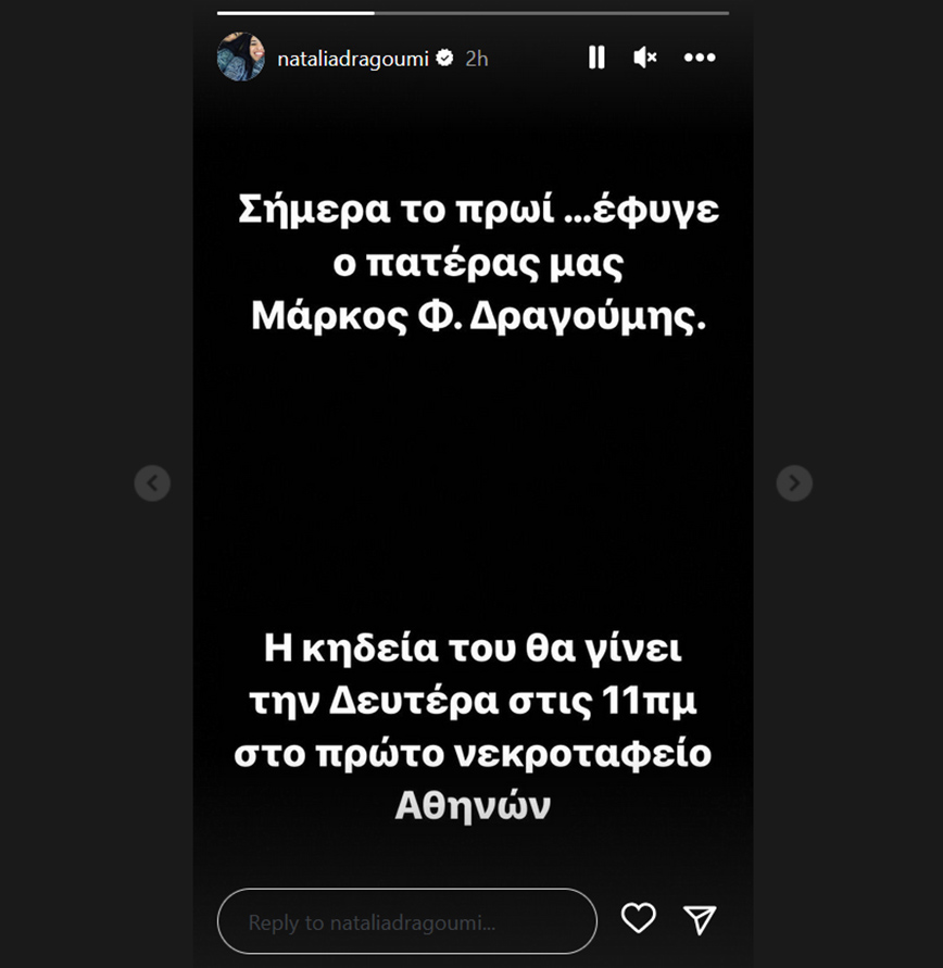 «Σήμερα το πρωί έφυγε ο πατέρας μας… Μάρκος Φ. Δραγούμης. Η κηδεία θα γίνει τη Δευτέρα στις 11 στο Α’ Νεκροταφείο Αθηνών» έγραψε λιτά η Ναταλία Δραγούμη στον λογαριασμό της στο Instagram.
