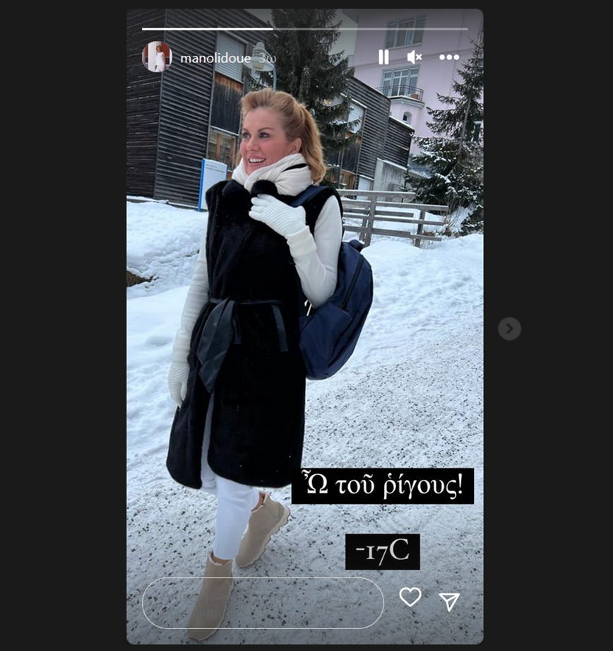 Η Ευγενία Μανωλίδου ανέβασε στο Instagram μια φωτογραφία στην οποία είναι αγκαλιά με τον Άδωνι Γεωργιάδη ενώ σε story της μοιράστηκε με τους followers της το τσουχτερό κρύο που έχει στο Νταβός, με το θερμόμετρο να δείχνει μείον 17 βαθμούς Κελσίου.