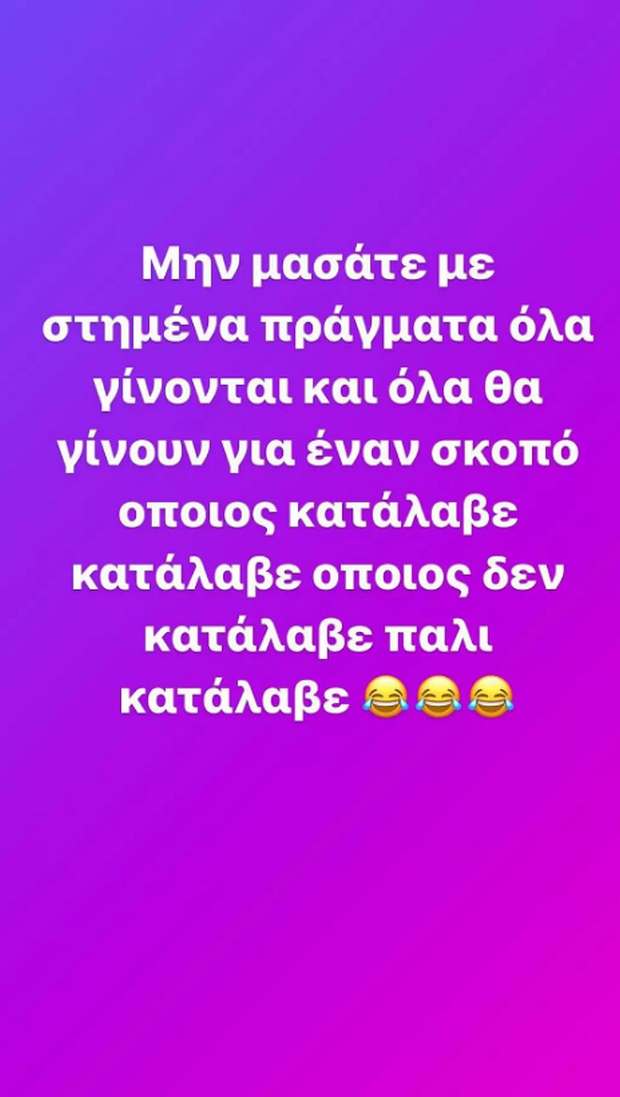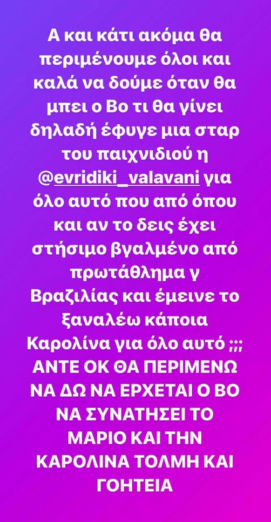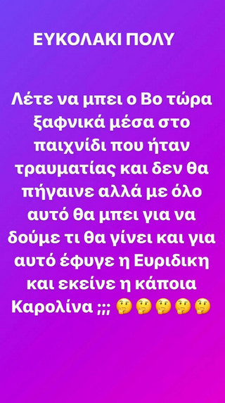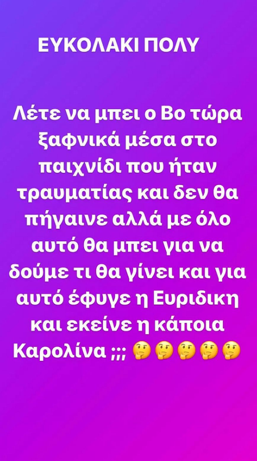«Μην μασάτε με στημένα πράγματα! Όλα γίνονται και όλα θα γίνουν για ένα σκοπό. Όποιος κατάλαβε, κατάλαβε και όποιος δεν κατάλαβε, πάλι κατάλαβε. Ευκολάκι πολύ. Λέτε να μπει ο Μπο τώρα ξαφνικά μέσα στο παιχνίδι που ήταν τραυματίας και δεν θα πήγαινε αλλά με όλο αυτό θα μπει για να δούμε τι θα γίνει και για αυτό έφυγε η Ευρυδίκη και εκείνη η κάποια Καρολίνα;;;» έγραψε, αρχικά, ο γνωστός τραγουδιστής στον προσωπικό του λογαριασμό στο Instagram.