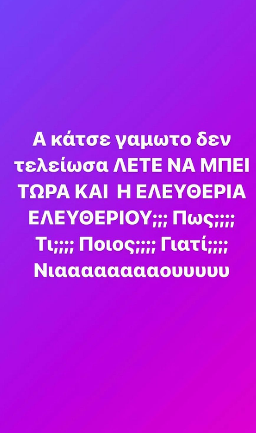«Α κάτσε, γαμώτο, δεν τελείωσα. Λένε να μπει τώρα και η Ελευθερία Ελευθερίου; Πως; Τι; Ποιος; Γιατί; Νιαου» κατέληξε ο Τριαντάφυλλος στις συνεχόμενες ιστορίες που δημοσίευσε στον προσωπικό του λογαριασμό στο Instagram