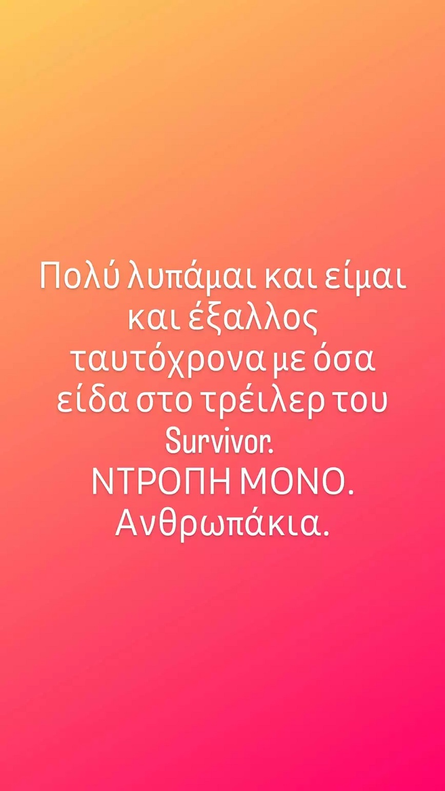 «Πολύ λυπάμαι και είμαι έξαλλος ταυτόχρονα με όσα είδα στο τρέιλερ του Survivor. ΝΤΡΟΠΗ ΜΟΝΟ. Ανθρωπάκια», έγραψε ο δημοσιογράφος στον προσωπικό του λογαριασμό στο Instagram, ενώ λίγο αργότερα επανήλθε με νέα ανάρτηση, στην οποία βάζει Χ στα ονόματα των δύο παικτών.