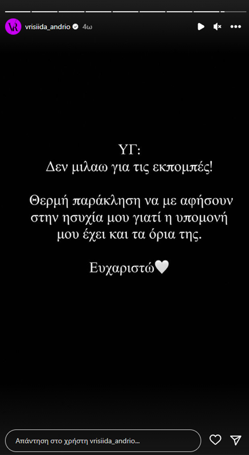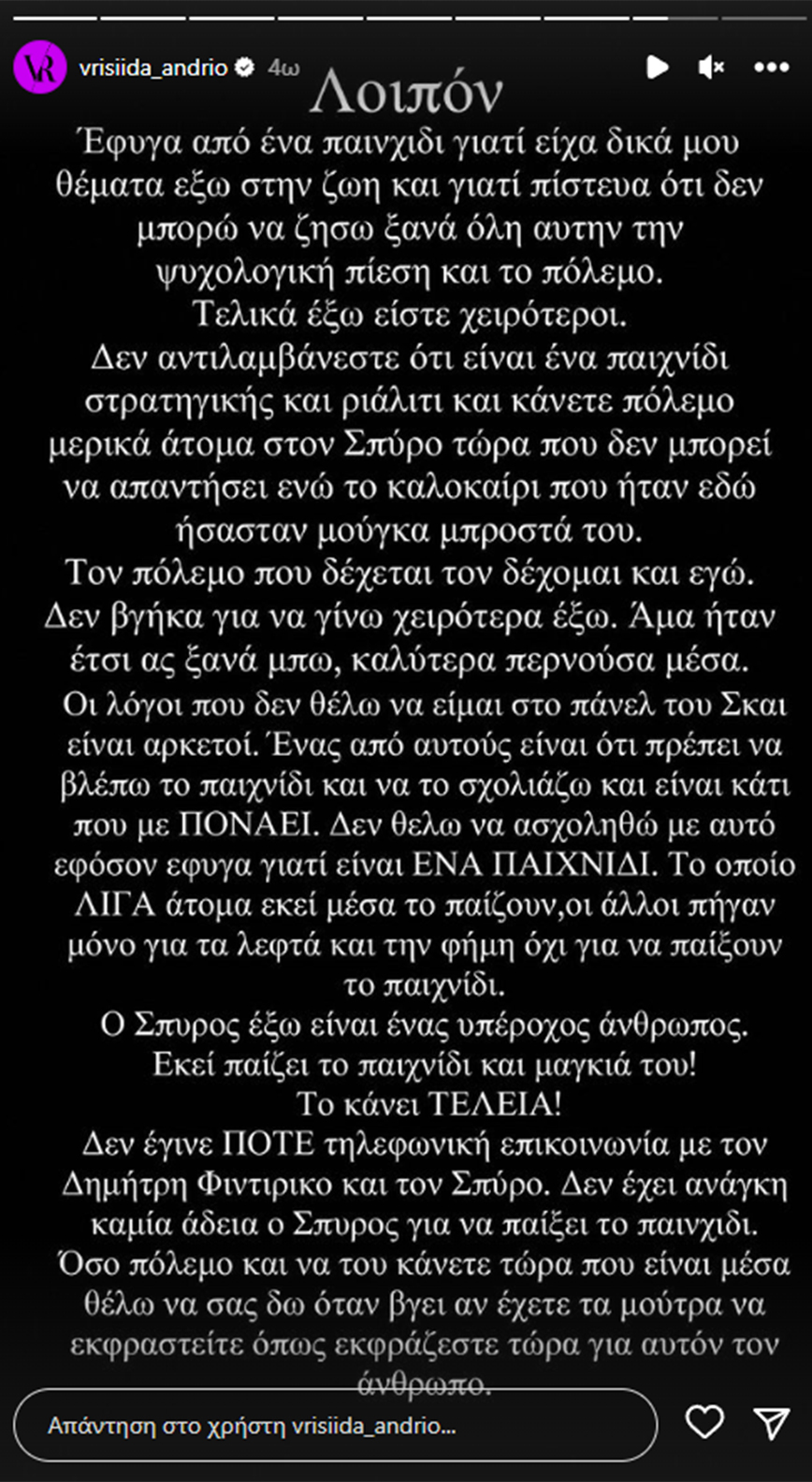 Συγκεκριμένα, η Βρισηίδα Ανδριώτου έγραψε: «Έφυγα από ένα παιχνίδι γιατί είχα δικά μου θέματα έξω στη ζωή και γιατί πίστευα ότι δεν μπορώ να ζήσω ξανά όλη αυτή την ψυχολογική πίεση και τον πόλεμο. Τελικά έξω είστε χειρότεροι. Δεν αντιλαμβάνεστε ότι είναι ένα παιχνίδι στρατηγικής και ριάλιτι και κάνετε πόλεμο μερικά άτομα στον Σπύρο τώρα που δεν μπορεί να απαντήσει ενώ το καλοκαίρι που ήταν εδώ ήσασταν μούγκα μπροστά του. Τον πόλεμο που δέχεται τον δέχομαι κι εγώ.