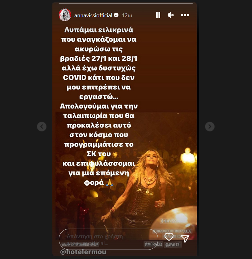 «Λυπάμαι ειλικρινά που αναγκάζομαι να ακυρώσω τις βραδιές 27 &28/1, αλλά έχω δυστυχώς Covid κάτι που δε μου επιτρέπει να εργαστώ. Απολογούμαι για την ταλαιπωρία που θα προκαλέσει αυτό στον κόσμο που προγραμμάτισε το Σαββατοκύριακο του και επιφυλάσσομαι για μια επόμενη φορά» γράφει η Άννα Βίσση στο Instagram.