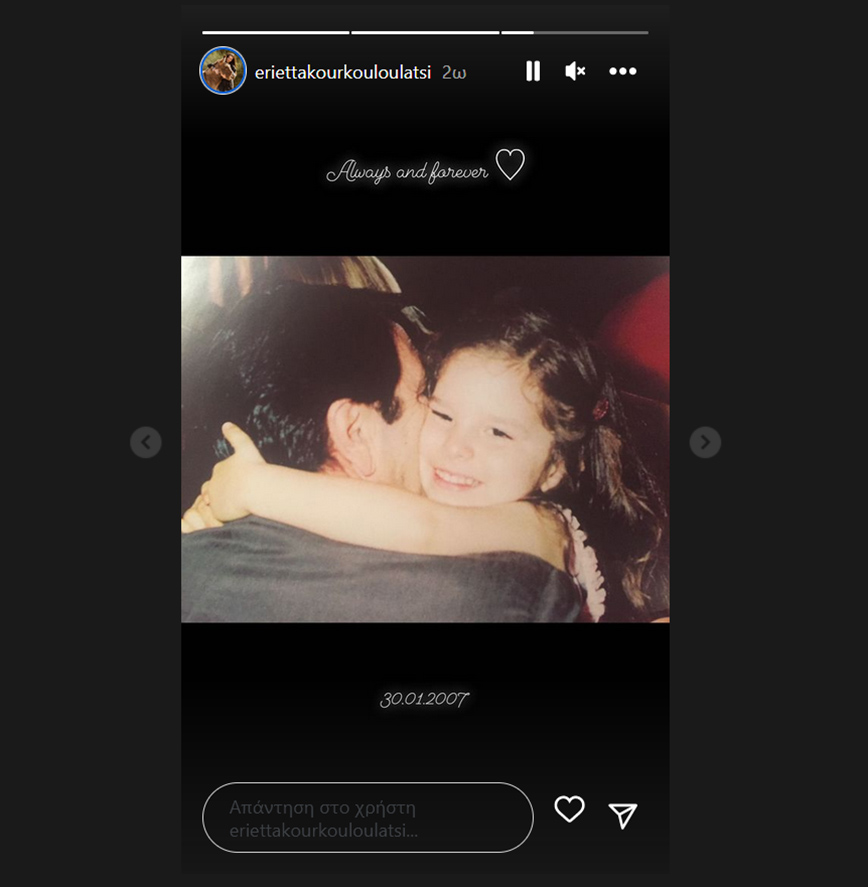 Στη φωτογραφία που ανέβασε στα stories της στο Instagram, η Εριέττα Κούρκουλου είναι μικρό κοριτσάκι στην αγκαλιά του πατέρα της. «Πάντα και για πάντα» έγραψε κάτω από τη φωτογραφία τους.