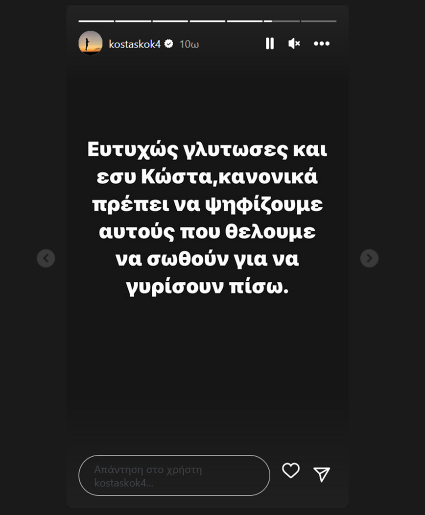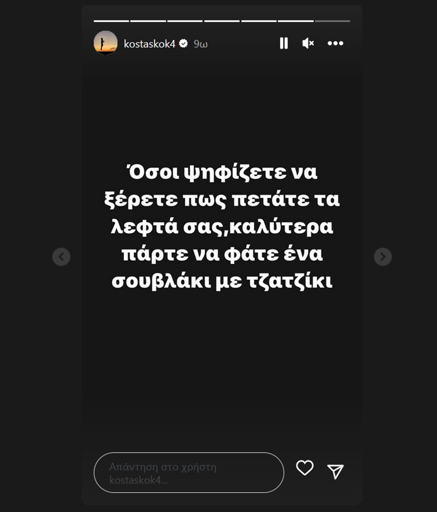 Συγκεκριμένα, ο Κώστας Κοκκινάκης έγραψε αρχικά στο Instagram: «Ευτυχώς γλύτωσες κι εσύ Κώστα. Κανονικά θα πρέπει να ψηφίζουμε αυτούς που θέλουμε να σωθούν για να γυρίσουν πίσω» και πρόσθεσε στη συνέχεια, σε δεύτερο μήνυμά του: «Όσοι ψηφίζετε να ξέρετε πως πετάτε τα λεφτά σας, καλύτερα πάρτε να φάτε ένα σουβλάκι με τζατζίκι».