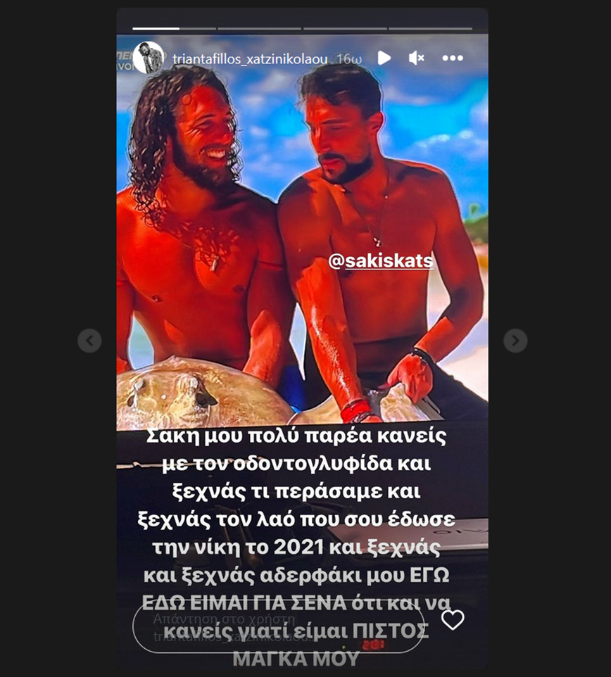 «Σάκη μου πολλή παρέα κάνεις με τον οδοντογλυφίδα και ξεχνάς τι περάσαμε και ξεχνάς τον λαό που σου έδωσε τη νίκη του 2021 και ξεχνάς αδερφάκι μου εγώ είμαι εδώ για σένα ότι και να κάνεις είμαι πιστός μάγκα μου» έγραψε ο Τριαντάφυλλος σε στόρι του στο Instagram.