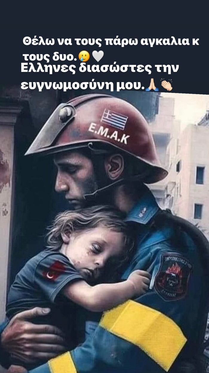 «Θέλω να τους πάρω αγκαλιά και τους δύο. Έλληνες διασώστες, την ευγνωμοσύνη μου», αναφέρει στην ανάρτησή της.