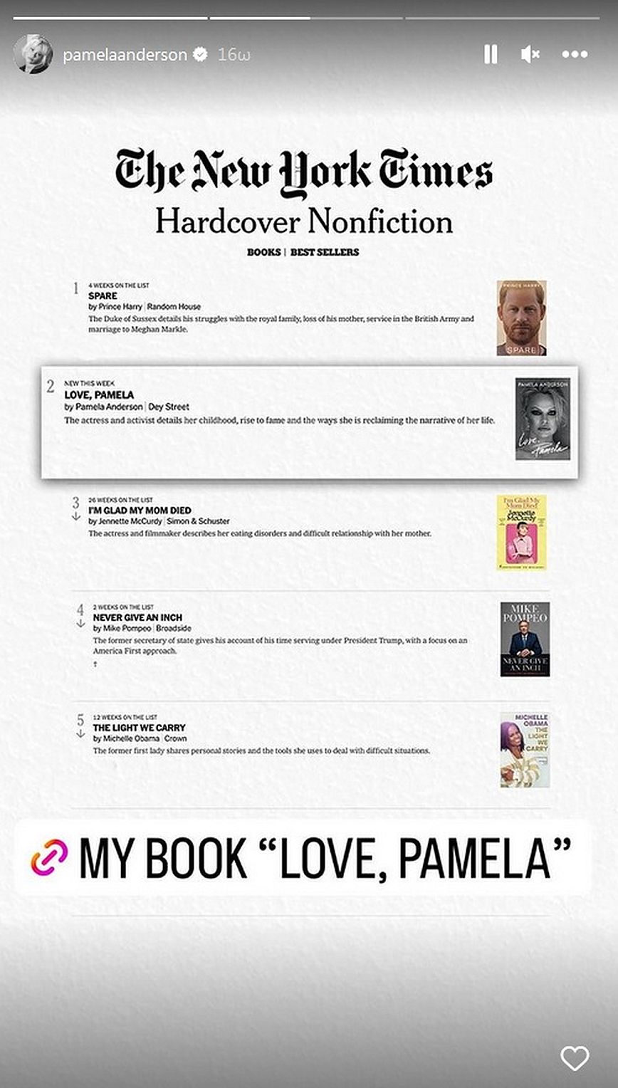 Σε ανάρτησή της στο Instagram, η Καναδή ηθοποιός, μοντέλο και ακτιβίστρια για την προστασία των ζώων έγραψε: «Μόλις έμαθα την είδηση… Το βιβλίο μου “Love, Pamela” είναι bestseller των New York Times. Σας ευχαριστώ από τα βάθη της καρδιάς μου… Τα όνειρα γίνονται πραγματικότητα, όταν δεν το περιμένεις… Ποτέ μην τα παρατάς. Η επιμονή στις δυσκολίες είναι για το καλύτερο όλων».