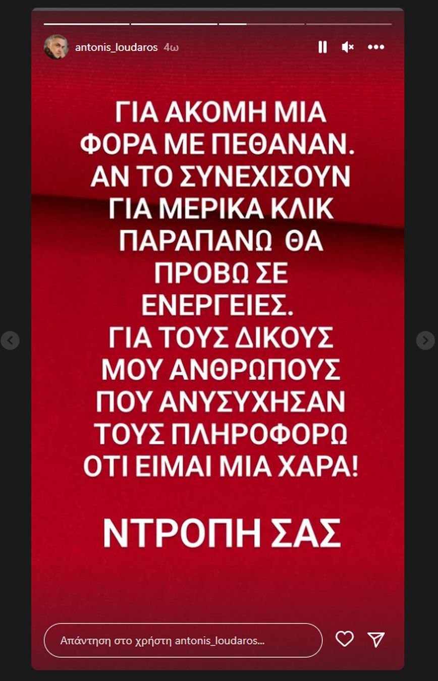 «Για ακόμη μία φορά με πέθαναν. Αν το συνεχίσουν για μερικά κλικ παραπάνω θα προβώ σε ενέργειες. Για τους δικούς μου ανθρώπους που ανησύχησαν τους πληροφορώ ότι είμαι μία χαρά ντροπή σας», ανέφερε στην ανάρτηση του ο Αντώνης Λουδάρος.