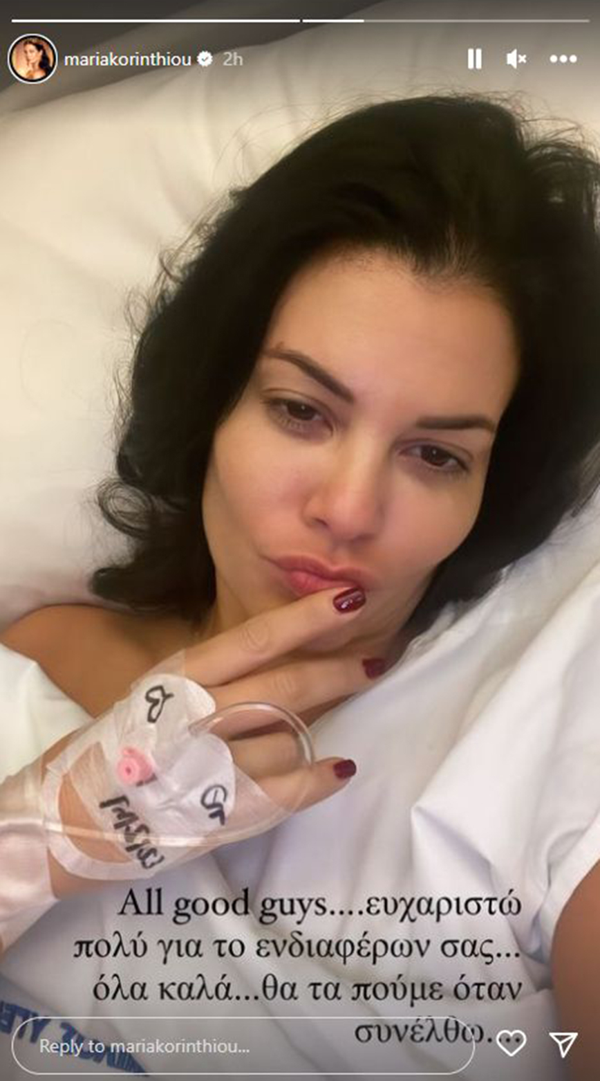 Η ηθοποιός δημοσίευσε ένα instastory στον προσωπικό της λογαριασμό στο Instagram από το κρεβάτι του νοσοκομείου κι έγραψε: «All good guys. Ευχαριστώ πολύ για το ενδιαφέρον σας. Όλα καλά. Θα τα πούμε όταν συνέλθω».