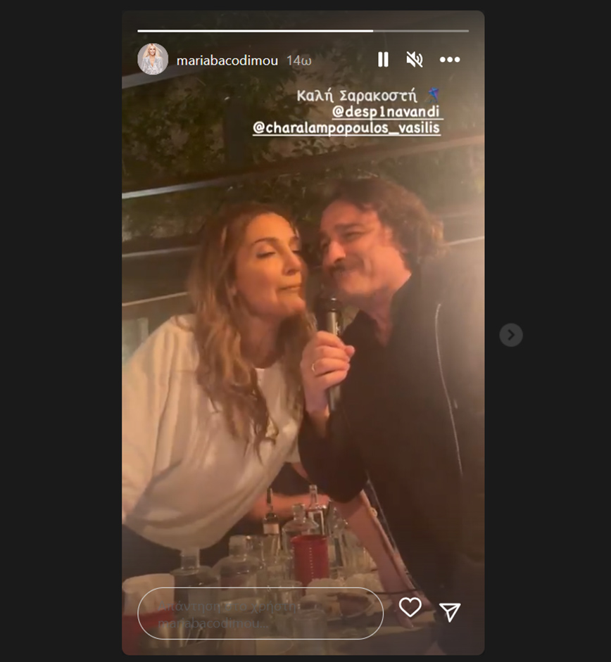 Στα stories που ανέβασε ο Βασίλης Χαραλαμπόπουλος στο Instagram, φαίνεται πως οι δυο τους διασκέδασαν το βράδυ της Δευτέρας, με τραγούδια και χορούς. Μαζί τους ήταν, μεταξύ άλλων και η Μαρία Μπακοδήμου, που τους απαθανάτισε σε βίντεο, το οποίο αναδημοσίευσε ο Βασίλης Χαραλαμπόπουλος στο προφίλ του.