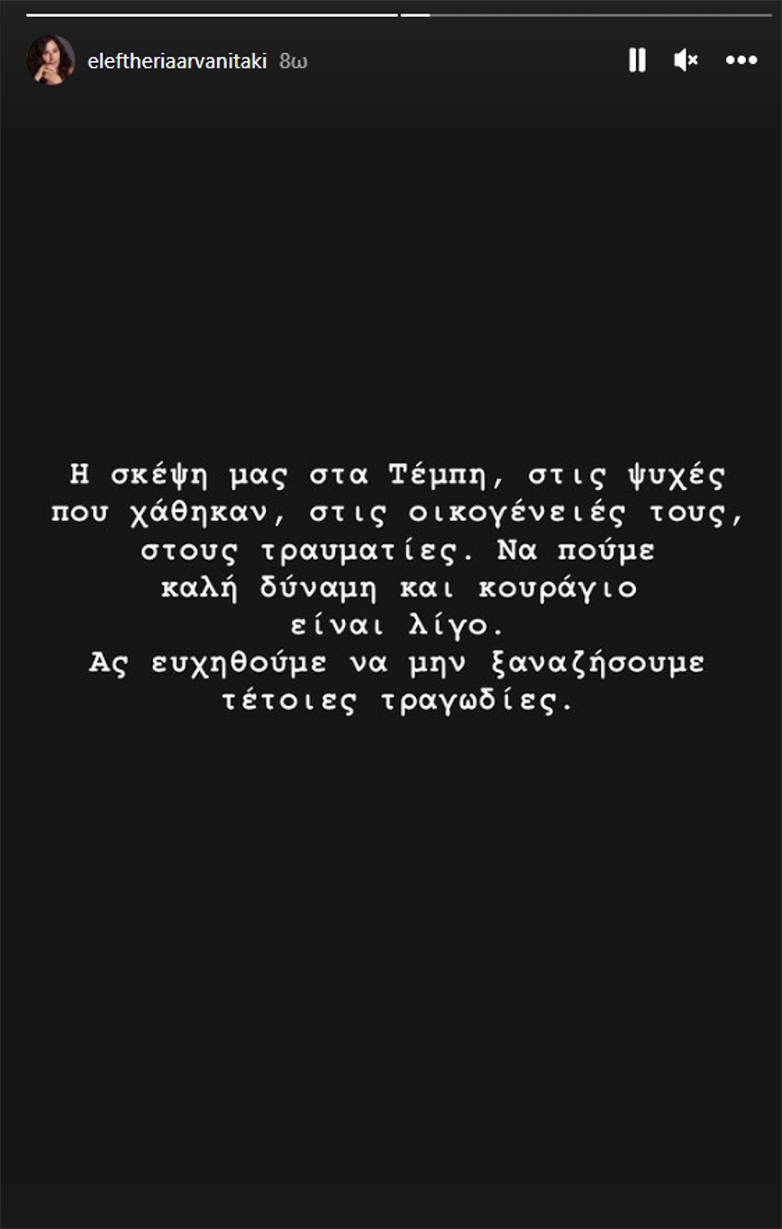 «Η σκέψη μας στα Τέμπη, στις ψυχές που χάθηκαν, στις οικογένειές τους, στους τραυματίες. Να πούμε καλή δύναμη και κουράγιο είναι λίγο. Ας ευχηθούμε να μην ξαναζήσουμε τέτοιες τραγωδίες».