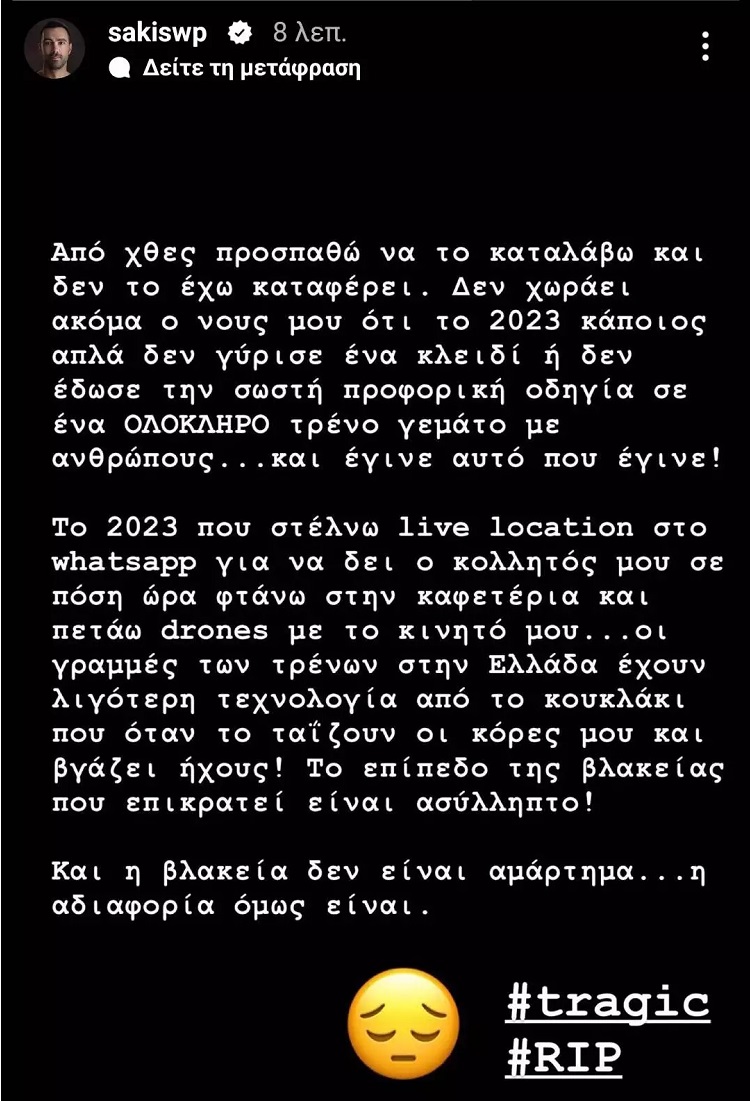 «Από χθες προσπαθώ να το καταλάβω και δεν το έχω καταφέρει. Δεν χωράει ακόμη ο νους μου ότι το 2023 κάποιος απλά δεν γύρισε ένα κλειδί ή δεν έδωσε τη σωστή προφορική οδηγία σε ένα ολόκληρο τρένο γεμάτο με ανθρώπους… και έγινε αυτό που έγινε!