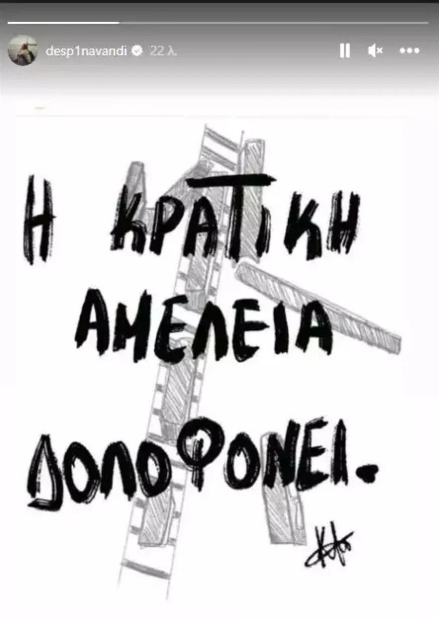 Η τραγουδίστρια κοινοποίησε ένα ασπρόμαυρο σκίτσο, με τα βαγόνια του τρένου και την επιγραφή: «Η κρατική αμέλεια δολοφονεί».