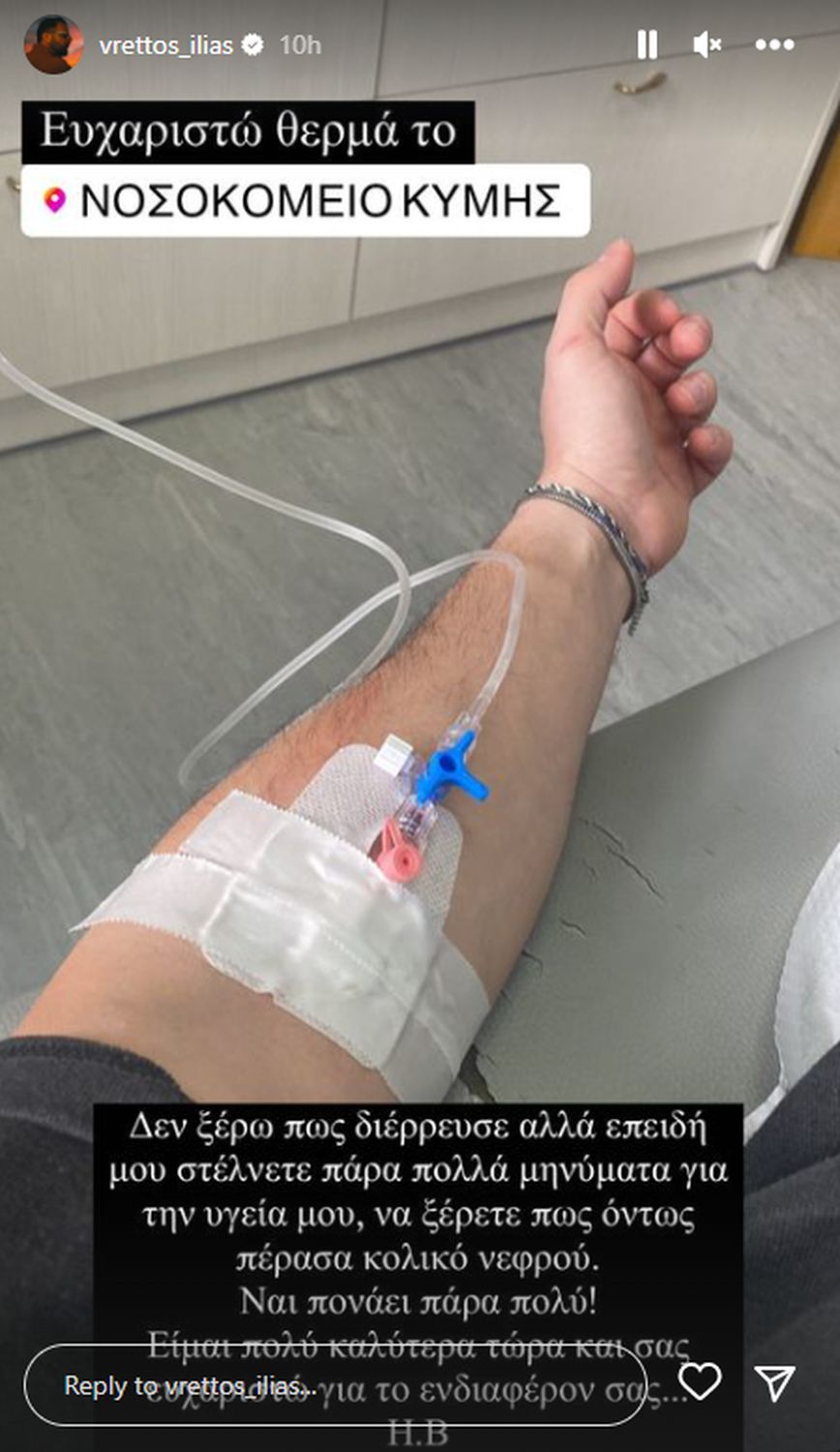 «Ευχαριστώ θερμά το νοσοκομείο Κύμης! Δεν ξέρω πως διέρρευσε αλλά επειδή μου στέλνετε πάρα πολλά μηνύματα για την υγεία μου, να ξέρετε πως όντως πέρασα κολικό νεφρού.