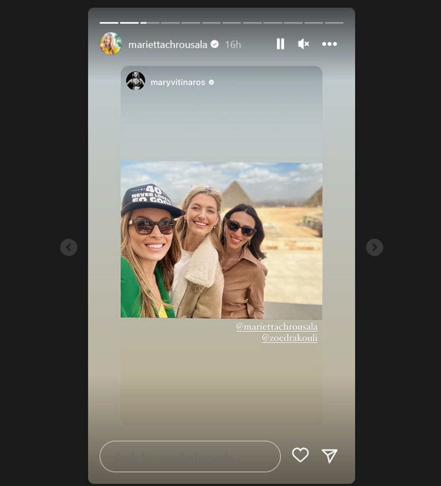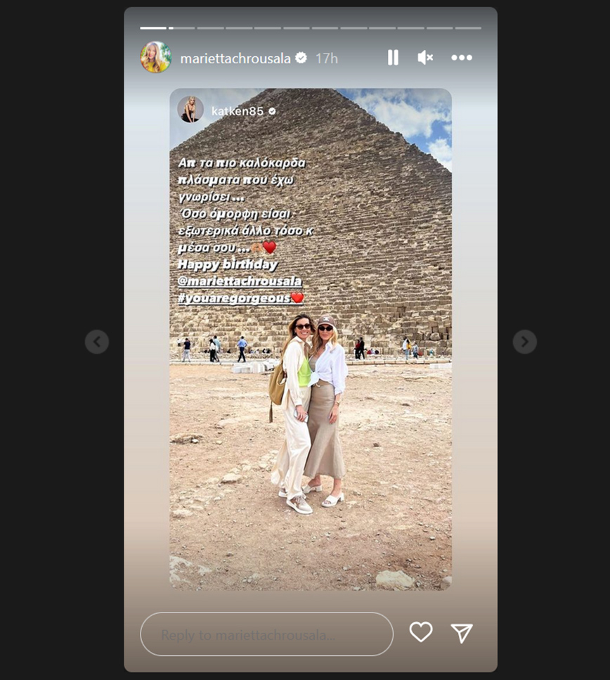 Παρουσιάστριες και μοντέλα ταξίδεψαν στο Κάιρο για τα γενέθλια της Μαριέττας Χρουσαλά. Το μοντέλο και παρουσιάστρια γιόρτασε τα γενέθλιά της στις 11 Μαρτίου μαζί με την οικογένειά της και τον σύζυγό της, Λέοντα Πατίτσα ενώ το Σαββατοκύριακο ταξίδεψε με αγαπημένους φίλους.