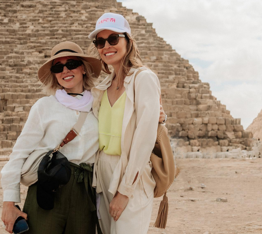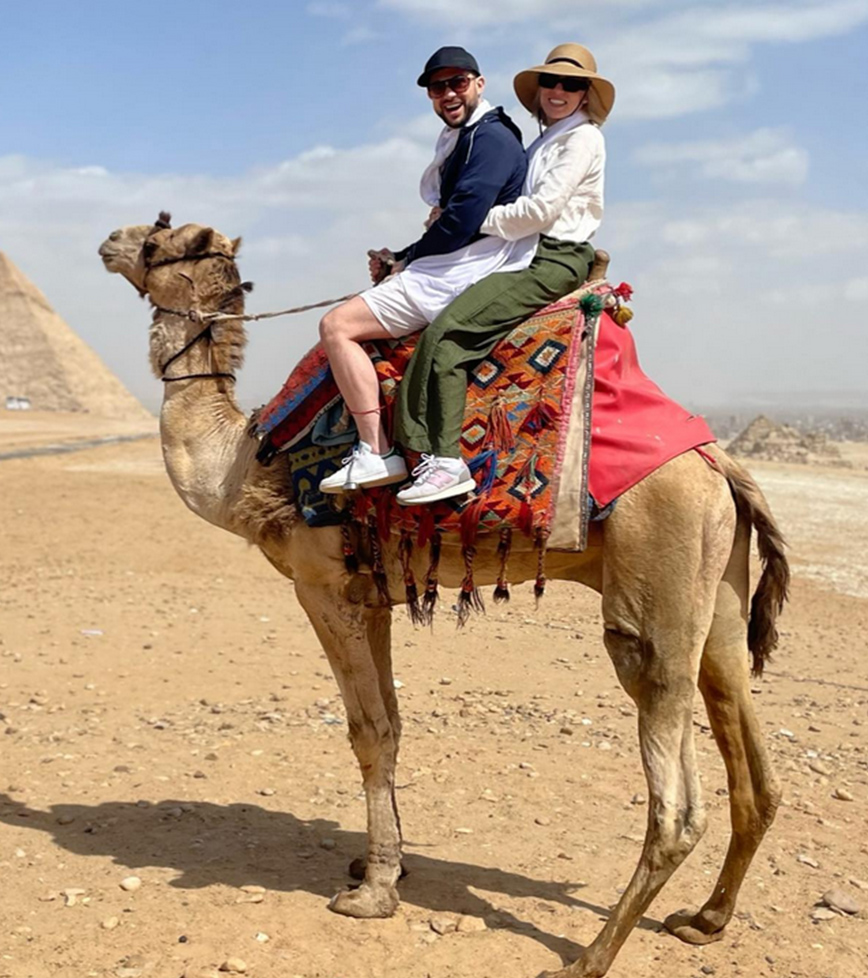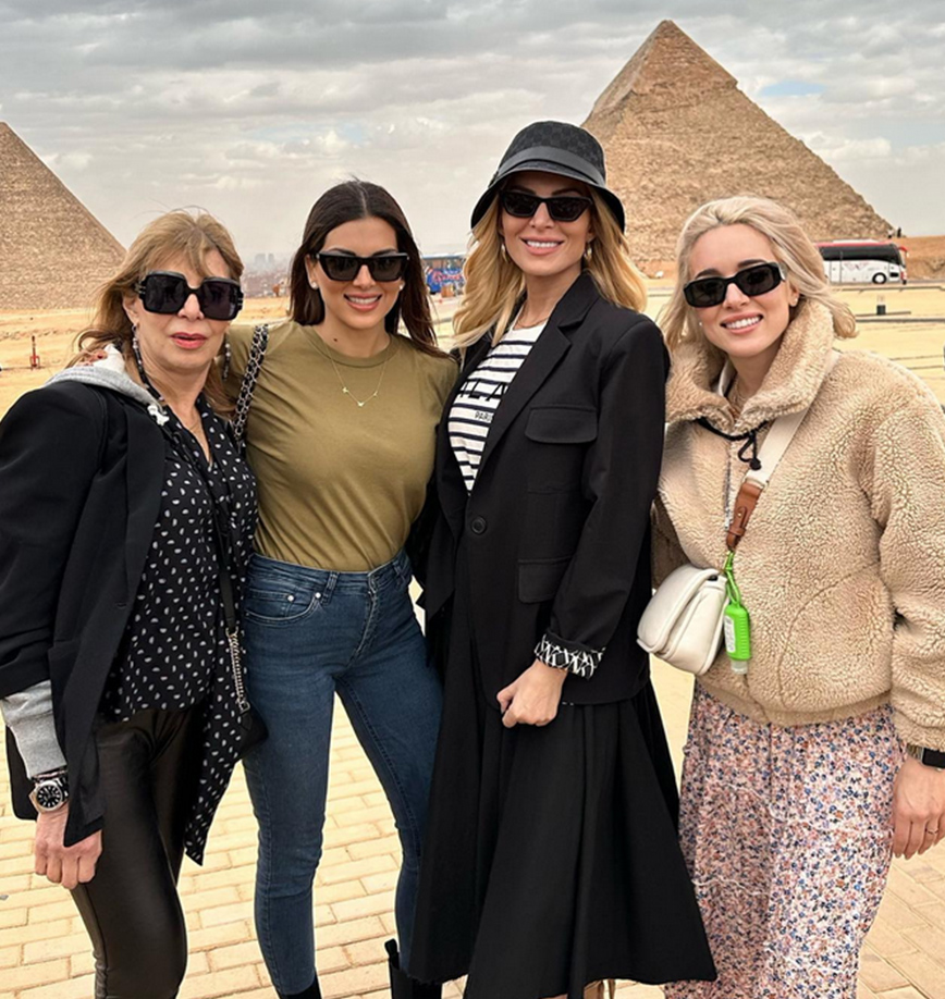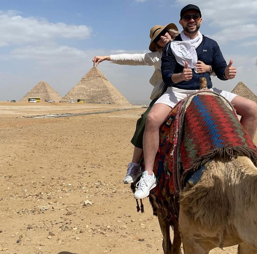 Σε μερικά στιγμιότυπα η Καλομοίρα ποζάρει αγκαλιά με τη Μαριέττα Χρουσαλά στο πάρτι αλλά και μπροστά από τις πυραμίδες και σε άλλα μαζί με τον σύζυγό της πάνω σε μία καμήλα.