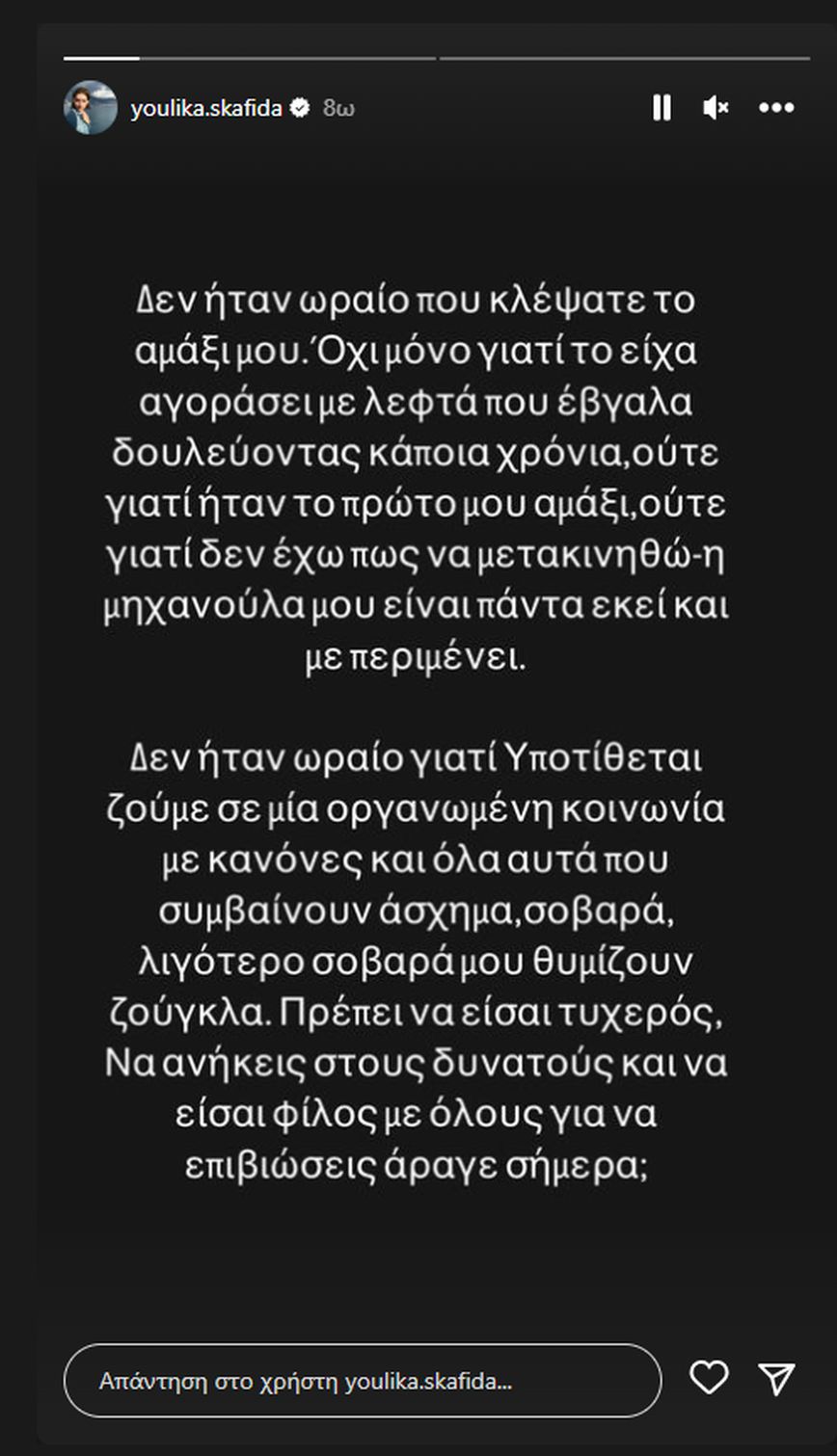 «Δεν ήταν ωραίο που κλέψατε το αμάξι μου. Όχι μόνο γιατί το είχα αγοράσει με λεφτά που έβγαλα δουλεύοντας κάποια χρόνια, ούτε γιατί ήταν το πρώτο μου αμάξι, ούτε γιατί δεν έχω πως να μετακινηθώ – η μηχανούλα μου είναι πάντα εκεί και με περιμένει», έγραψε αρχικά η Γιούλικα Σκαφιδά στο μήνυμά της.