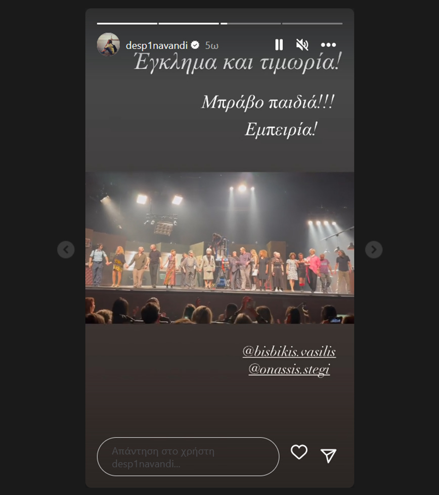 Στην πρεμιέρα της παράστασης «Έγκλημα και τιμωρία» στην Κεντρική Σκηνή της Στέγης του Ιδρύματος Ωνάση, με πρωταγωνιστή τον Βασίλη Μπισμπίκη, βρέθηκε χθες η Δέσποινα Βανδή. Μετά το τέλος της παράστασης η τραγουδίστρια ανέβασε ένα story στο Instagram την ώρα της υπόκλισης των ηθοποιών. «Μπράβο παιδιά! Εμπειρία» έγραψε.