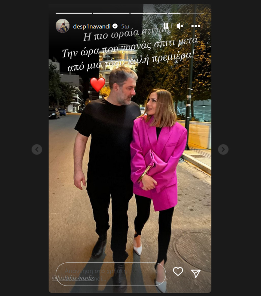 Στο δεύτερο story η Δέσποινα Βανδή φωτογραφήθηκε με τον αγαπημένο της. «Η πιο ωραία στιγμή. Την ώρα που γυρνάς σπίτι μετά από μια τόσο καλή πρεμιέρα» έγραψε χαρακτηριστικά.