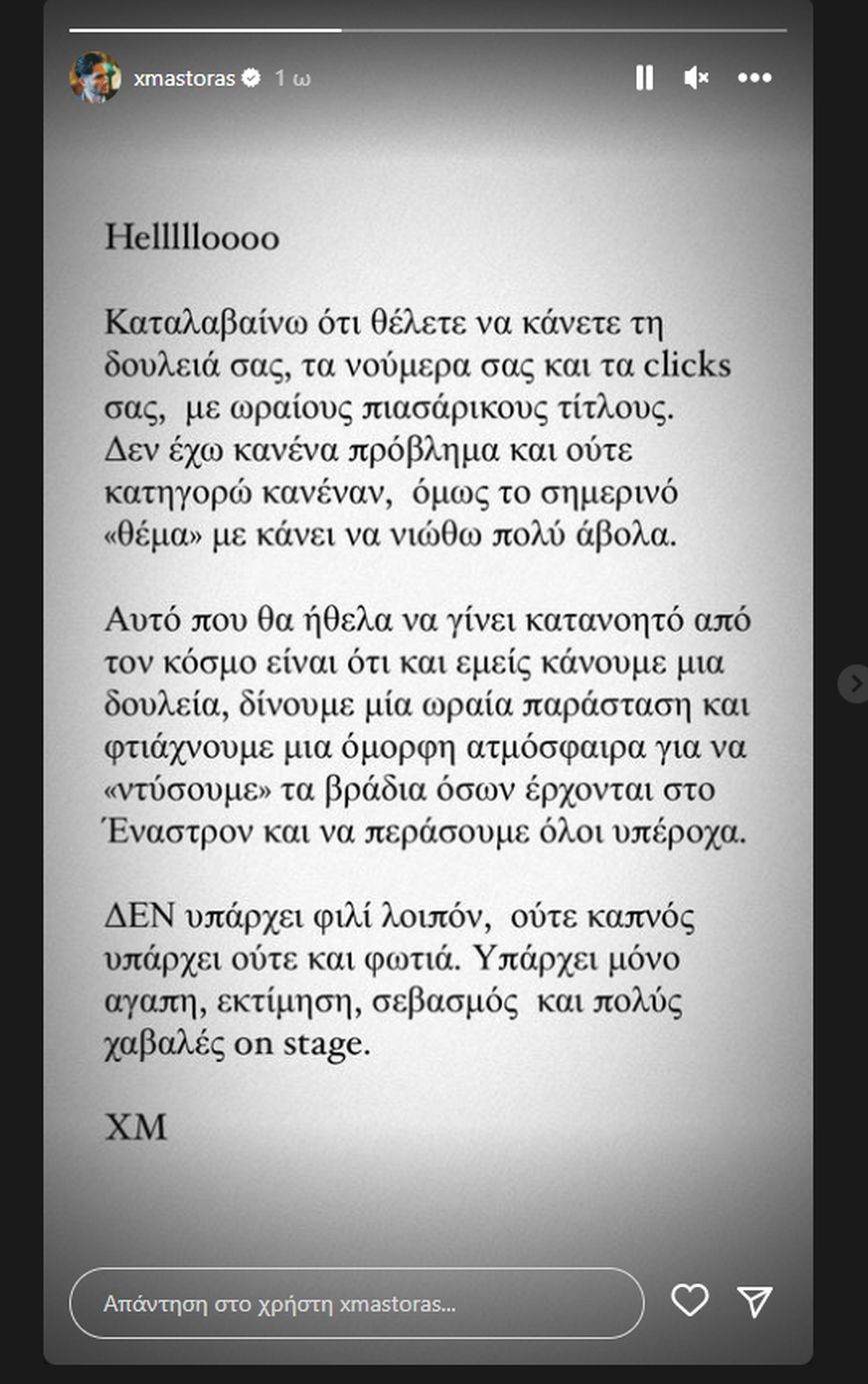Στο story του έγραψε: «Καταλαβαίνω ότι θέλετε να κάνετε τη δουλειά σας, τα νούμερά σας, τα clicks σας με ωραίους πιασάρικους τίτλους. Δεν έχω κανένα πρόβλημα και ούτε κατηγορώ κανέναν, όμως το σημερινό “θέμα” με κάνει να νιώθω πολύ άβολα. Αυτό που θα ήθελα να γίνει κατανοητό από τον κόσμο είναι ότι κι εμείς κάνουμε μια δουλειά, δίνουμε μια ωραία παράσταση και φτιάχνουμε μια όμορφη ατμόσφαιρα για να “ντύσουμε” τα βράδια όσων έρχονται στο Έναστρον και να περάσουμε όλοι υπέροχα. Δεν υπάρχει φιλί λοιπόν, ούτε καπνός υπάρχει, ούτε και φωτιά. Υπάρχουν όμως αγάπη, εκτίμηση, σεβασμός και πολύς χαβαλές on stage».