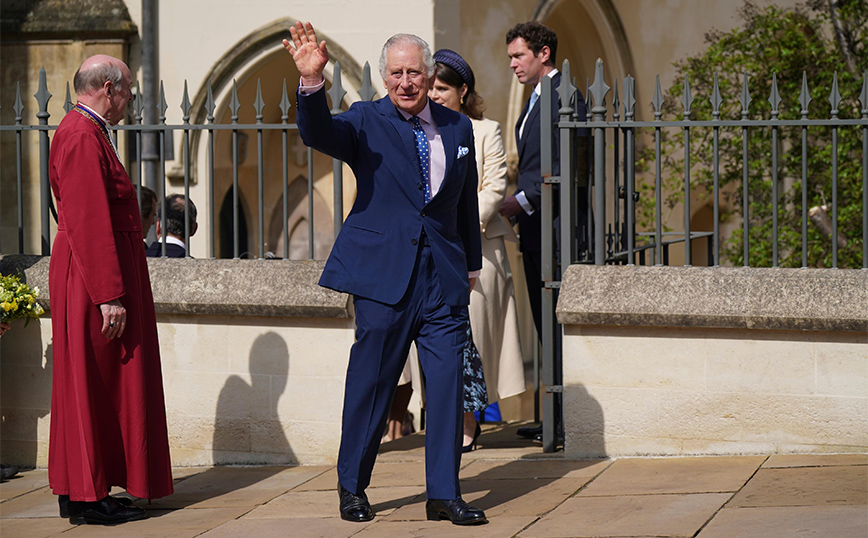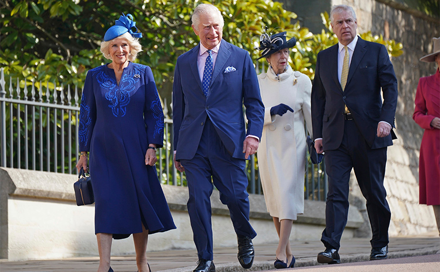Ο Βασιλιάς Κάρολος και η Καμίλα φορούσαν ασορτί μπλε ρούχα, καθώς ο βασιλιάς εμφανίστηκε με κοστούμι και η βασιλική σύζυγος με φόρεμα – παλτό της Anna Valentine με καπέλο Philip Treacy.