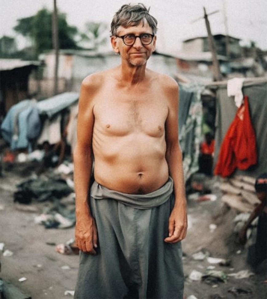 Στο φωτογραφικό κολάζ, ο Αμερικανός επιχειρηματίας και συνιδρυτής της Microsoft, ο 67χρονος Μπιλ Γκέιτς, εμφανίζεται γυμνόστηθος και φορώντας μόνο ένα γκρίζο παντελόνι που έμοιαζε σαν σακί, να στέκεται έξω από μια παράγκα. Η εικόνα του πάμφτωχου Γκέιτς – είναι ο τέταρτος πλουσιότερος άνθρωπος στον κόσμο – σύμφωνα με το Bloomberg News, έχει συγκεντρώσει περισσότερα από 10.000 likes.