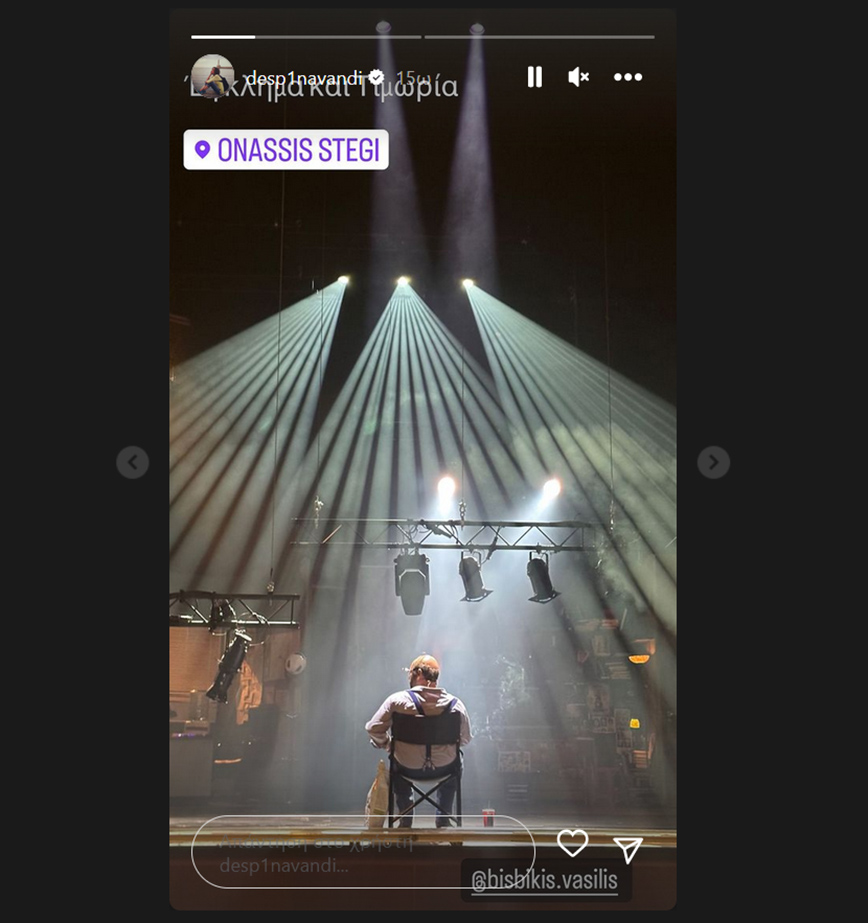 Στην τελευταία παράσταση του Βασίλη Μπισμπίκη στη σκηνή του ιδρύματος Ωνάση με το «Έγκλημα και Τιμωρία», το οποίο σκηνοθέτησε ο ίδιος, η Δέσποινα Βανδή βρέθηκε κοντά στον αγαπημένο της και τον θαύμασε επί σκηνής. Πριν τον θαυμάσει, όμως, στη σκηνή του ιδρύματος Ωνάση, η τραγουδίστρια επισκέφθηκε το καμαρίνι του αγαπημένου της και του άφησε ένα τρυφερό μήνυμα, γράφοντας στον καθρέφτη του «Σ’ αγαπώ».