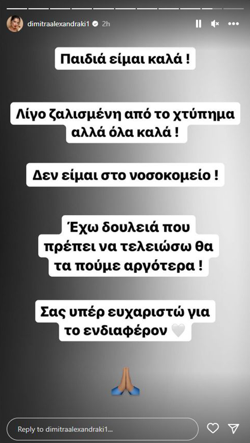 «Ήμουν σταματημένη σε κόκκινο σηματοδότη και με άλλο αυτοκίνητο μπροστά μου. Δεν φρέναρα απότομα, δεν ήμουν εν κινήσει. Ξαφνικά ένα μεγάλο μπαμ με κράτησε η ζώνη να μη φύγω μπροστά, ασυναίσθητα το δεξί πόδι στο φρένο το τέντωσα να μην χτυπήσω και τον μπροστά μου, απλά ο αυχένας και το κεφάλι μου τραντάχτηκαν αρκετά γιατί έπεσε χωρίς φρένα. Είμαστε όλοι καλά, 1-2 μέρες κεφάλι/αυχένας θα έρθουν στη θέση τους. Αυτό έχει σημασία. Τα υπόλοιπα λαμαρίνες είναι. Φτιάχνονται» έγραψε η Δήμητρα Αλεξανδράκη