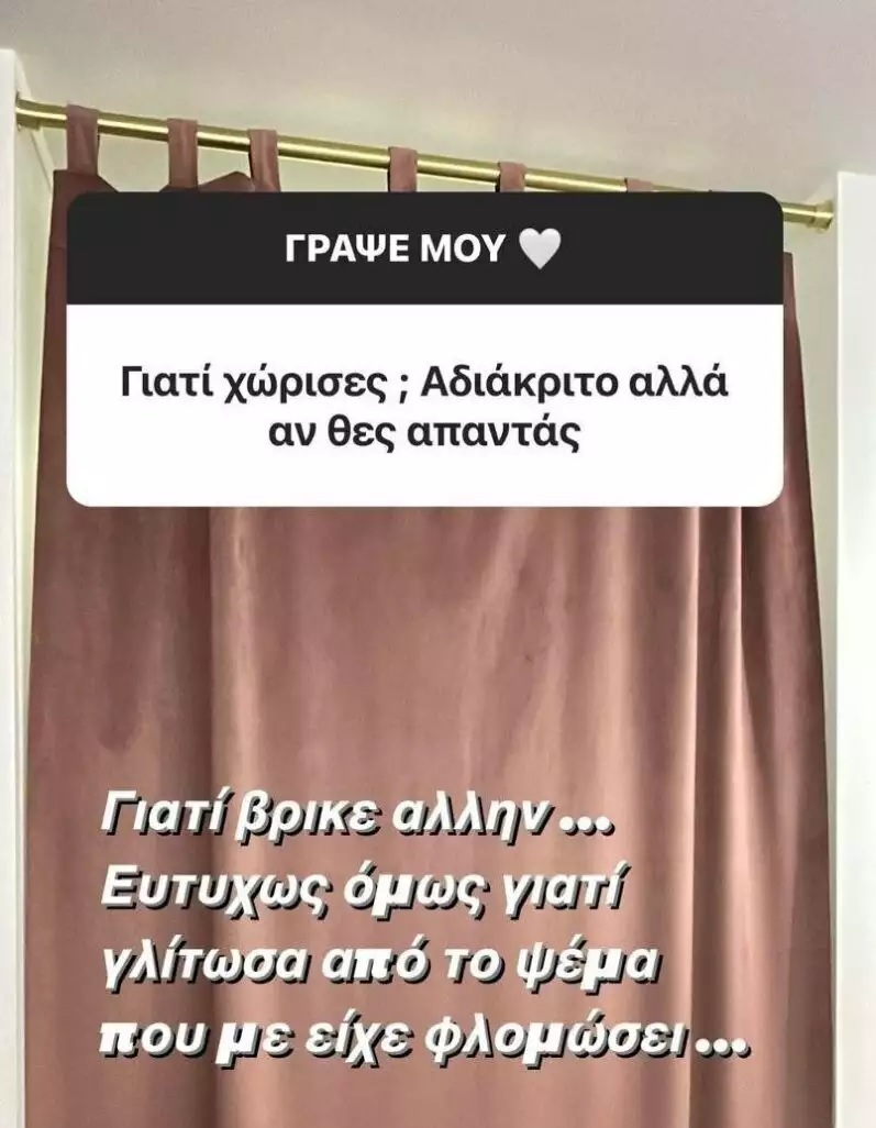 Η Ευρυδίκη Παπαδοπούλου μέχρι στιγμής δεν είχε κάνει καμία αποκάλυψη για τον λόγο που οδήγησε τους δυο τους σε διαφορετικά μονοπάτια. Το απόγευμα της Πέμπτης (27/4) η πρώην παίκτρια του ριάλιτι επιβίωσης, σε ένα Q&A που έστησε μέσα από τον προσωπικό της λογαριασμό στο Instagram, ζητώντας από τους followers της να τη ρωτήσουν οτιδήποτε θέλουν, αποκάλυψε μεταξύ άλλων την αιτία που χώρισε από τον σύντροφό της, λίγο πριν χορέψουν τον χορό του Ησαΐα.
