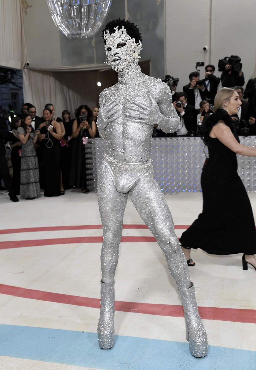 Το σώμα του ήταν ολόκληρο ασημένιο. Καλύφθηκε με body painting, ασημένιες πούλιες και αμέτρητες πέρλες σε ασημί χρώμα δημιουργώντας ένα εντυπωσιακό look που δεν άφησε κανέναν αδιάφορο. Φυσικά, τράβηξε τα βλέμματα και το ασημένιο στρινγκ που φόρεσε και η μάσκα στο πρόσωπό του, η οποία είχε… μουστάκι γάτας, ως φόρος τιμής στην Choupette, την γάτα του αείμνηστου Καρλ Λάγκερλφελντ. Ο Lil Nas X ολοκλήρωσε την εμφάνιση με ένα ζευγάρι πλατφόρμες, επίσης σε ασημί χρώμα.