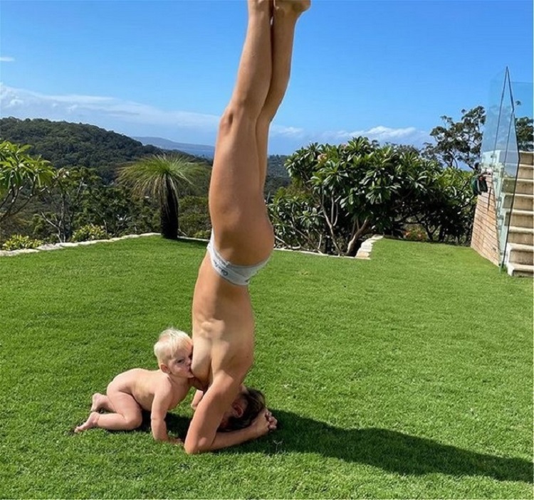 Στη φωτογραφία, κάνει κατακόρυφο και ο γιος της θηλάζει καθιστός.