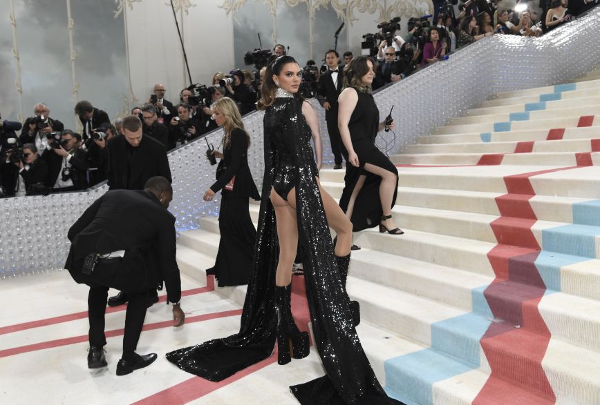 Στην κεντρική εκδήλωση στο Μητροπολιτικό Μουσείο Τέχνης, η Jenner φόρεσε ένα μαύρο κοστούμι Marc Jacobs με παγιέτες -χωρίς παντελόνι στο πλαίσιο της τάσης της A-list pantsless- και μακριά φουσκωτά μανίκια.