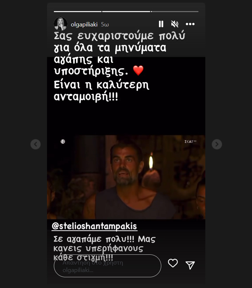 «Σας ευχαριστούμε πολύ για όλα τα μηνύματα αγάπης και υποστήριξης. Είναι η καλύτερη ανταμοιβή!! Σε αγαπάμε πολύ» έγραψε χαρακτηριστικά σε story της η Όλγα Πηλιάκη.