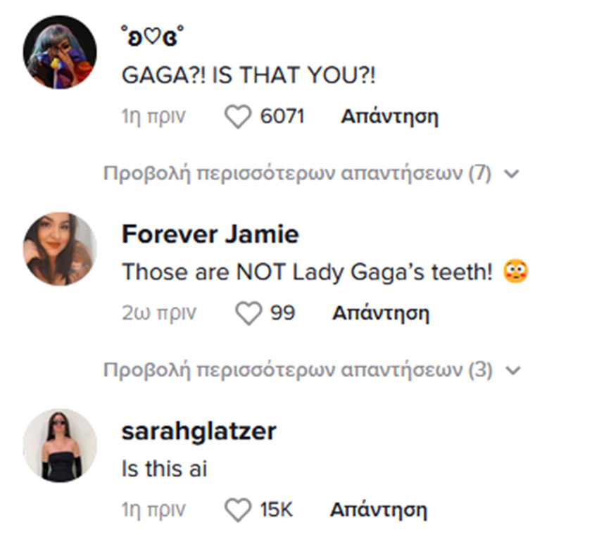 «Gaga? Εσύ είσαι;», «Αυτά δεν είναι τα δόντια της Lady Gaga», «Μήπως είναι ΑΙ;» σχολίασαν μερικοί. Άλλοι ανέφεραν πως «μοιάζει διαφορετική αλλά δεν ξέρω γιατί».
