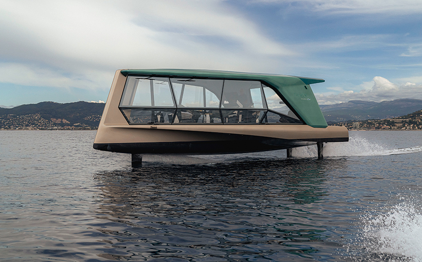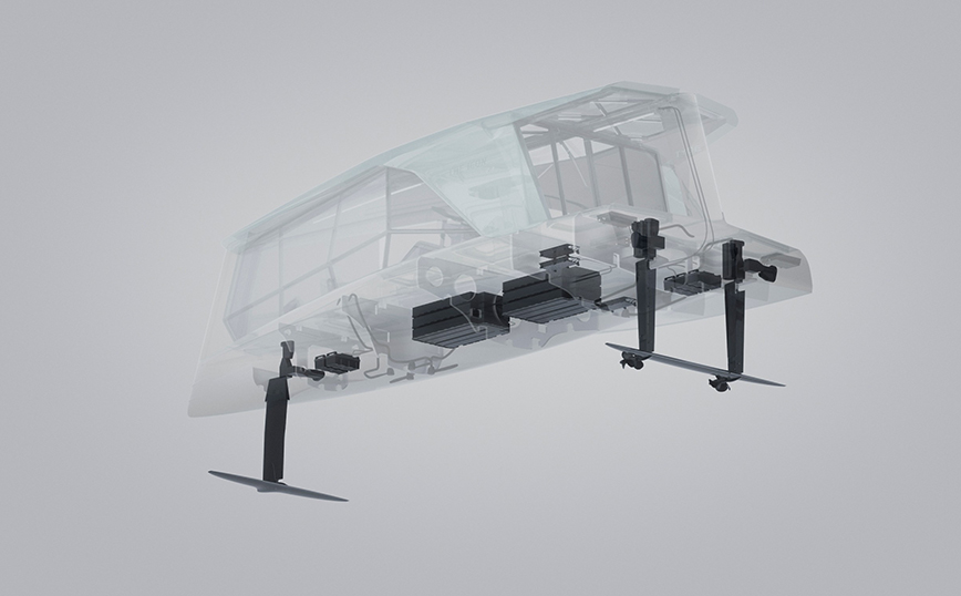 Αυτό δημιουργεί μια πολύ ευρύχωρη είσοδο στο πολυτελές σαλόνι. Η ίδια η γάστρα ξεχωρίζει με την ελαφριά δομή της που παραπέμπει σε origami. Καθώς η τεχνολογία foiling υποστηρίζει μια ιδιαίτερα ομαλή εμπειρία ταξιδιού, οι σχεδιαστές θέλησαν να αντικαταστήσουν τα συμβατικά πλευρικά τμήματα ενός σκάφους με μεγάλες γυάλινες επιφάνειες. Συνεπώς, οι επιβάτες απολαμβάνουν μια εξαιρετική θέα ενώ γλιστρούν πάνω από το νερό. Οι μοντέρνες λωρίδες φωτισμού LED στην πλώρη και την πρύμνη, καθώς και στα σημεία σύνδεσης φόρτισης αναδεικνύουν την εμβληματική εικόνα του σκάφους.