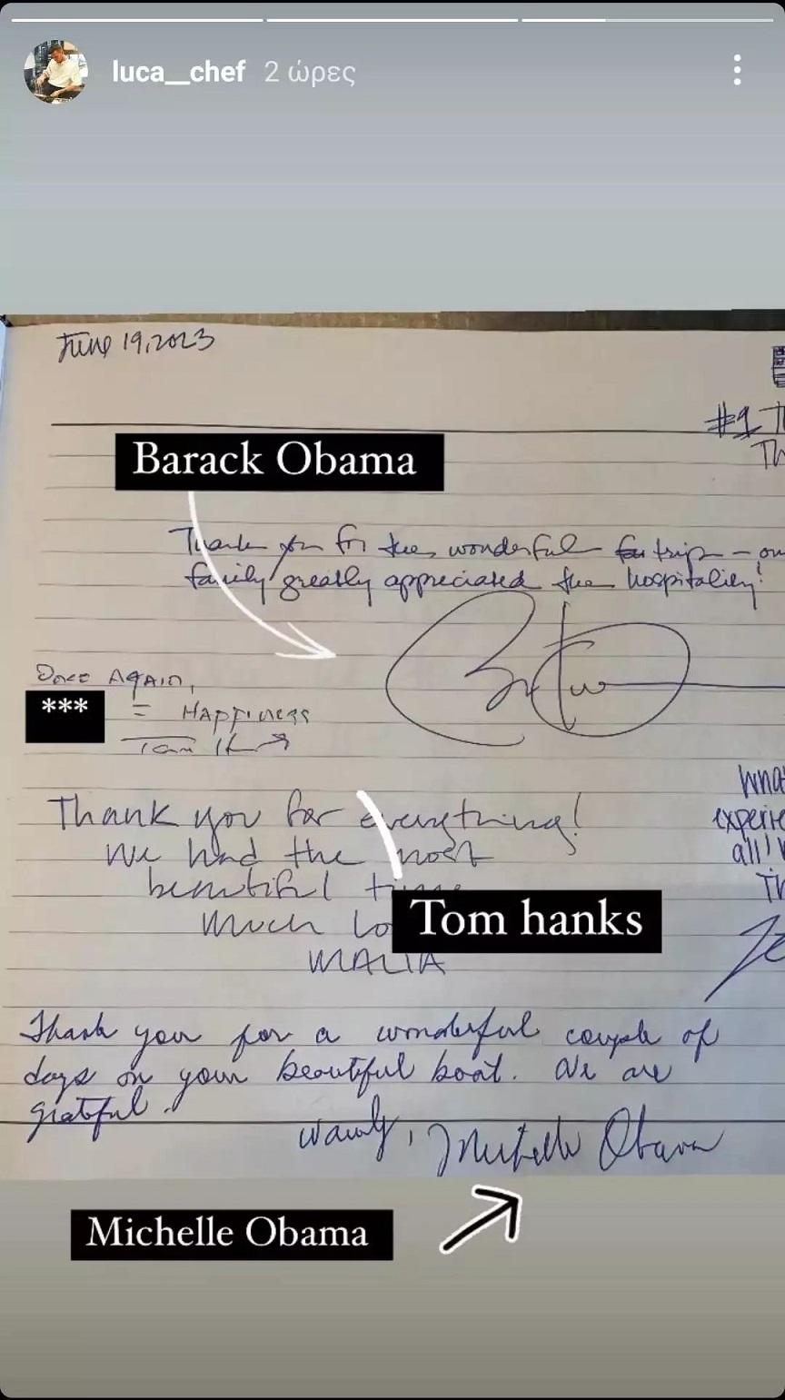 Ο Ιταλός σεφ Λούκα Φουρίνι ήταν αυτός που είχε το προνόμιο να μαγειρέψει για τον Μπαράκ και την Μισέλ Ομπάμα, ενώ τόσο το ζευγάρι όσο και ο Τομ Χανκς τον ευχαρίστησαν μετά το γεύμα τους με χειρόγραφα σημειώματα. Ο σεφ, μάλιστα, δημοσίευσε στον προσωπικό του λογαριασμό στο Instagram τα εν λόγω ευχαριστήρια μηνύματα.