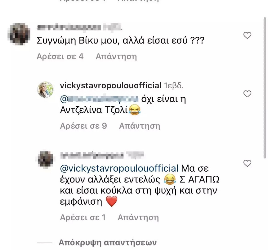 «Συγνώμη Βίκυ μου, αλλά είσαι εσύ;;», έγραψε μια follower, με τη Βίκυ Σταυροπούλου να δίνει απάντηση επική! «Όχι είναι η Αντζελίνα Τζολί», έγραψε και το σχόλιο της έκανε χαμό!