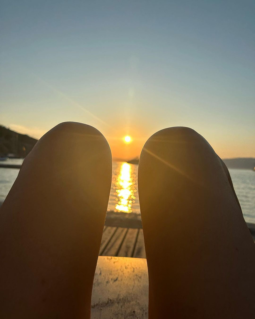 Ανάμεσα στα στιγμιότυπα, φαίνεται να ποζάρει με μαγιό με φόντο τις παραλίες, φωτογραφίζει τη θάλασσα, τις γραφικές ταβέρνες του νησιού και το ηλιοβασίλεμα. Ενώ, από την ανάρτησή της δεν λείπει και ο Βασίλης Μπισμπίκης, ο οποίος σε μια φωτογραφία έχει μόλις βγει από τη θάλασσα.