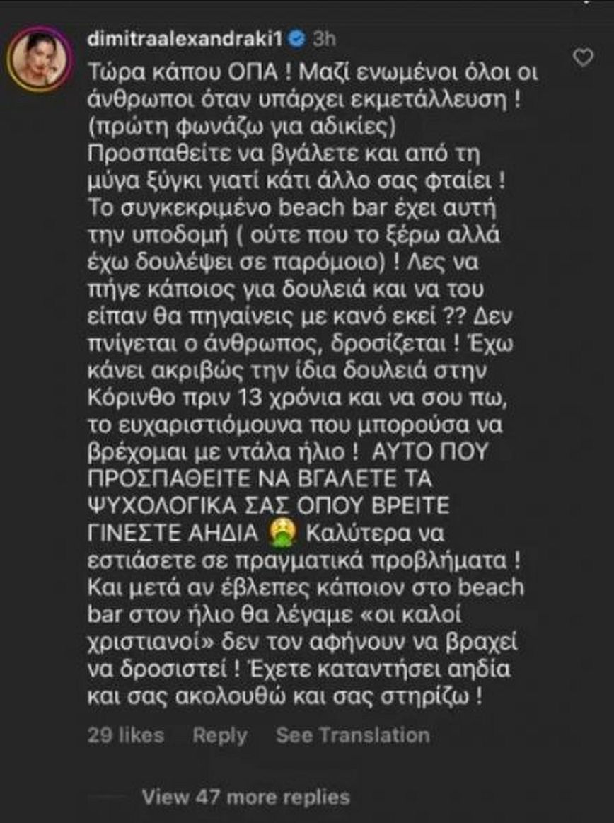 Αυτό που προσπαθείτε να βγάλετε τα ψυχολογικά σας όπου βρείτε γίνεστε αηδία. Καλύτερα να εστιάσετε στα πραγματικά προβλήματα. Και μετά αν έβλεπες κάποιον στο beach bar στον ήλιο θα λέγαμε “οι καλοί χριστιανοί” δεν τον αφήνουν να βραχεί να δροσιστεί! Έχετε καταντήσει αηδία και σας ακολουθώ και σας στηρίζω».