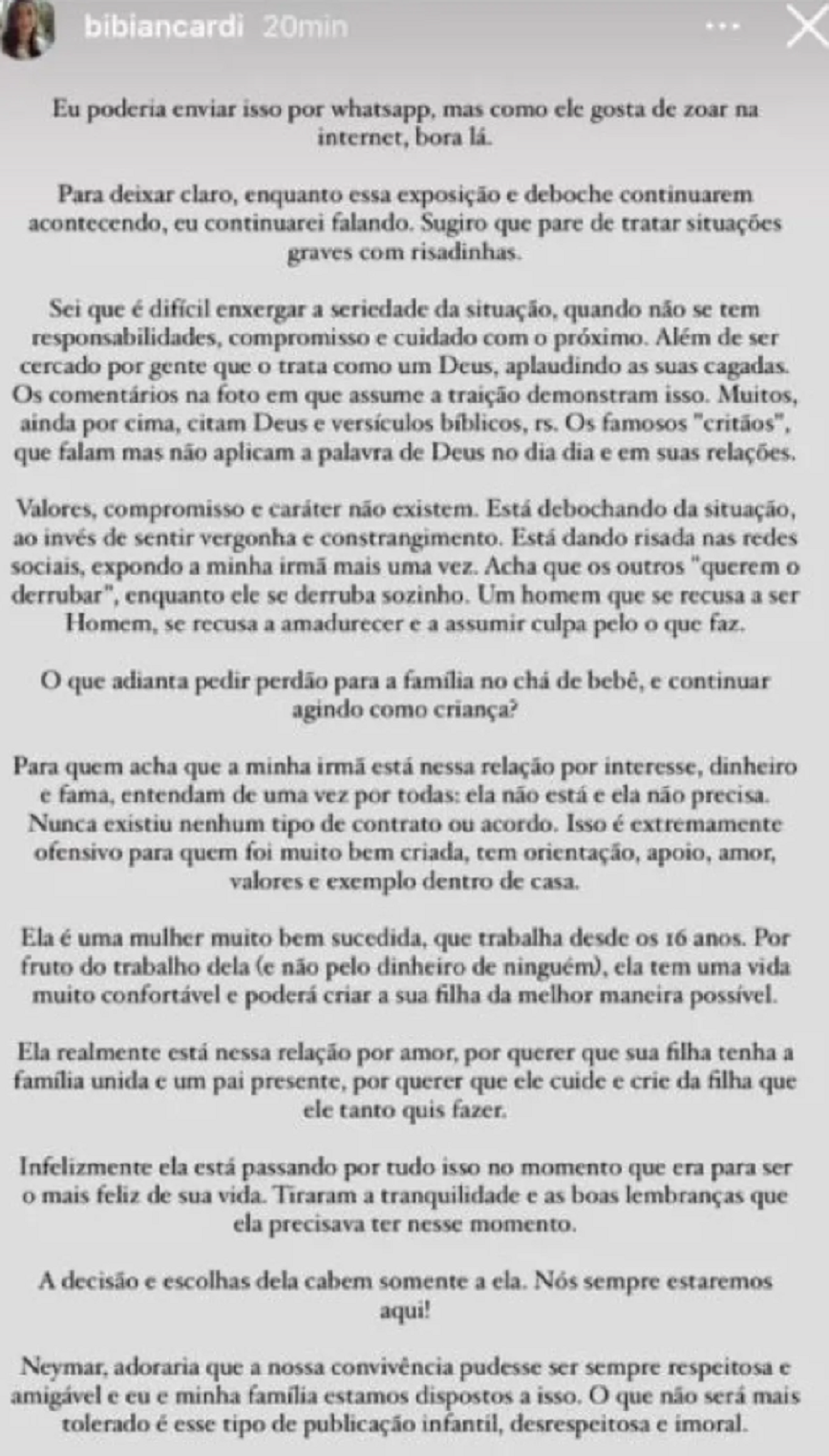 Πρόσφατα αποκαλύφθηκε πως ο Νεϊμάρ έχει συμφωνήσει με την έγκυο σύντροφο του Μπρούνα Μπιανκάρντι να μπορεί να την απατάει υπό όρους και η αδερφή της ξέσπασε, τονίζοντας πως θα έπρεπε εκείνος να νιώθει αηδία.