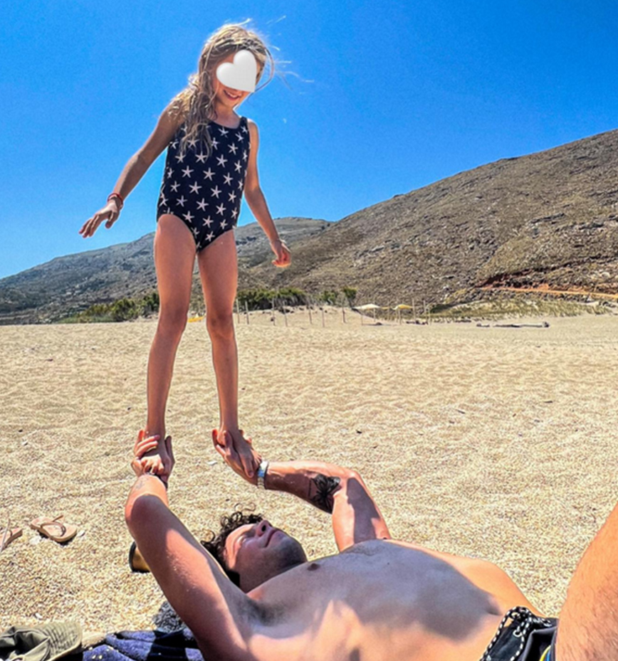 Τα δύο αδέρφια φαίνεται πως παίζουν μαζί, καθώς ο Άγγελος κρατά τη Μαρίνα από τις πατούσες και τη σηκώνει ψηλά. Στη λεζάντα της φωτογραφίας του, ο ίδιος έγραψε «μία μέρα στην παραλία είναι πάντα μια ωραία μέρα!».