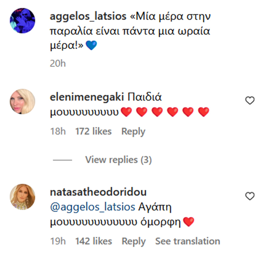 Φυσικά, τα likes και τα σχόλια έπεσαν βροχή από τους 69.5 χιλιάδες ακολούθους του. Ανάμεσα σε εκείνους που σχολίασαν τη φωτογραφία του Άγγελου και της Μαρίνας, ήταν και η μητέρα τους, Ελένη Μενεγάκη, αλλά και η Νατάσα Θεοδωρίδου.