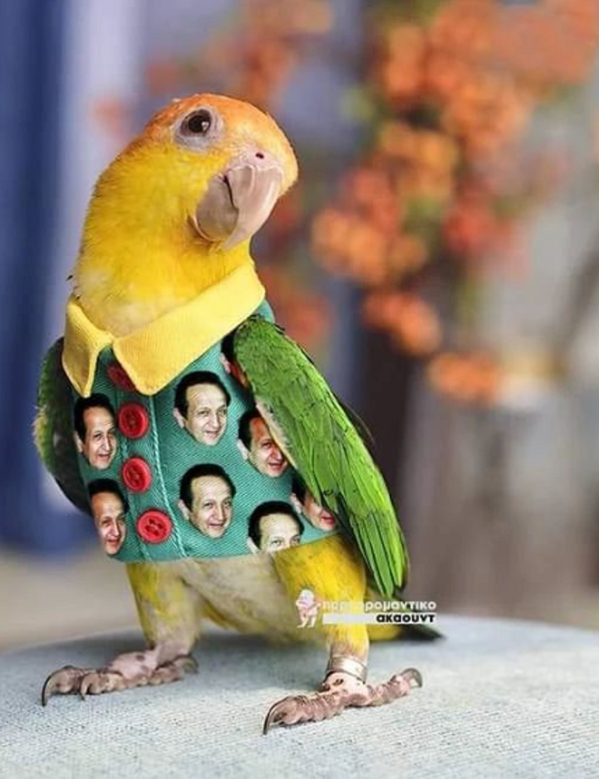 Μάλιστα, ένας φίλος του «έντυσε» το πτηνό με photoshop, όπου του πρόσθεσε ένα πουκάμισο, το οποίο είχε το πρόσωπο του προέδρου του ΣΕΗ, με αφορμή το viral πουκάμισο με τους παπαγάλους που φόρεσε ο βουλευτής στην ορκωμοσία στη Βουλή.
