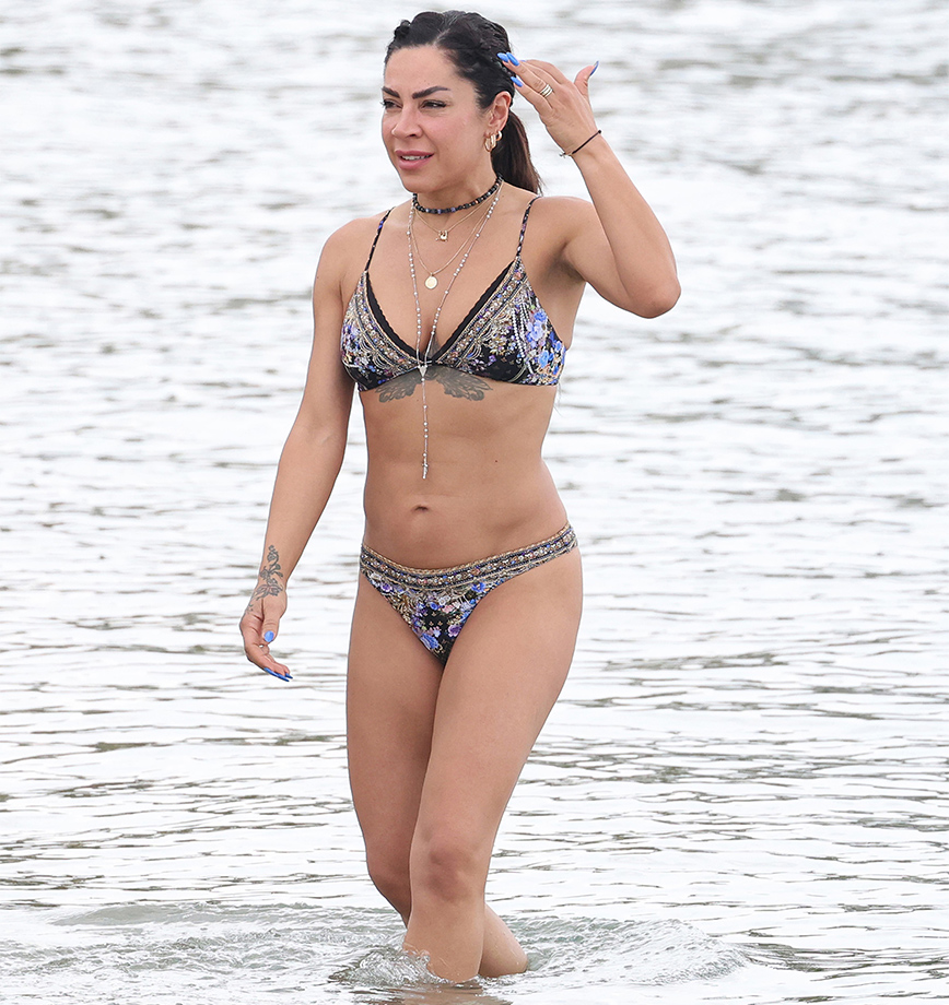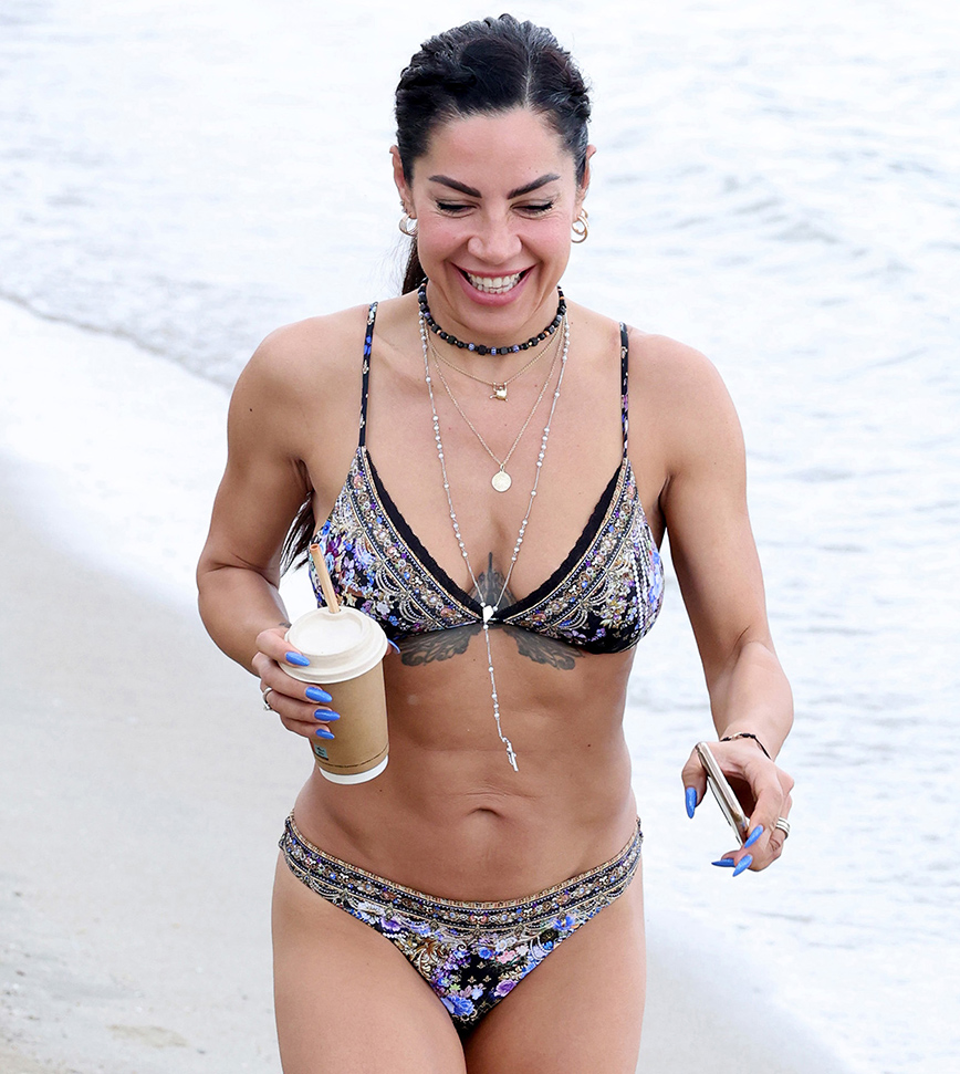 Η τραγουδίστρια φορούσε ένα μπικίνι με σχέδια, είχε τα μαλλιά της κοτσίδα και απολάμβανε τον καφέ της πριν βουτήξει για να δροσιστεί.