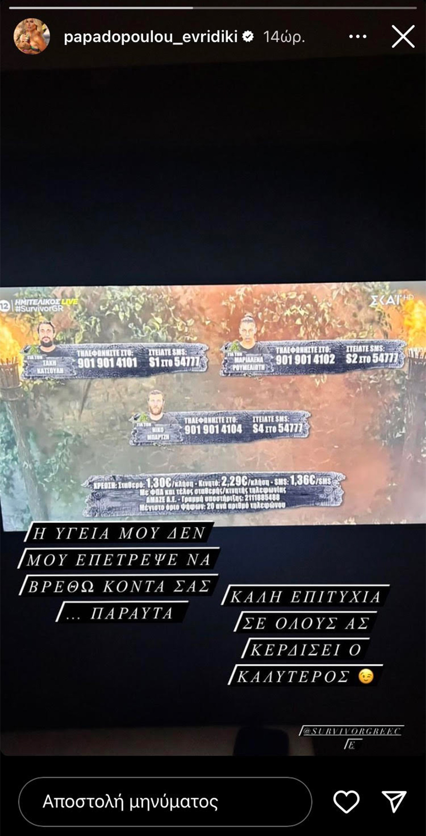 «Η υγεία μου δεν μου επέτρεψε να βρεθώ κοντά σας. Παρά ταύτα καλή επιτυχία σε όλους, ας κερδίσει ο καλύτερος», έγραψε η Ευρυδίκη Παπαδοπούλου στο στόρι της.