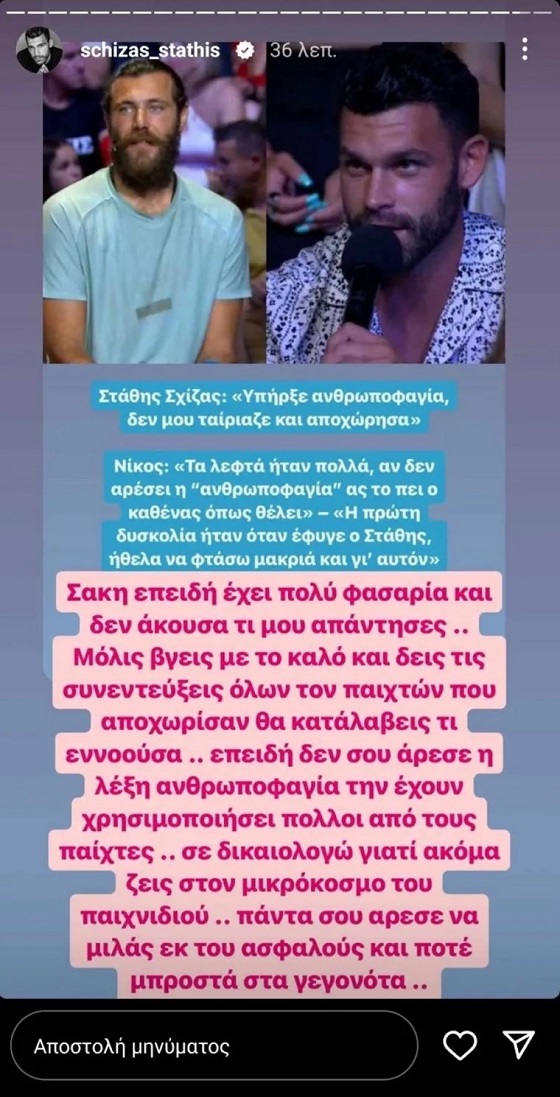 Και κάπου εκεί, έμελλε να έρθει η απάντηση του Στάθη Σχίζα, όχι όμως δια ζώσης, αλλά μέσω ενός ποσταρίσματος στο Instagram.