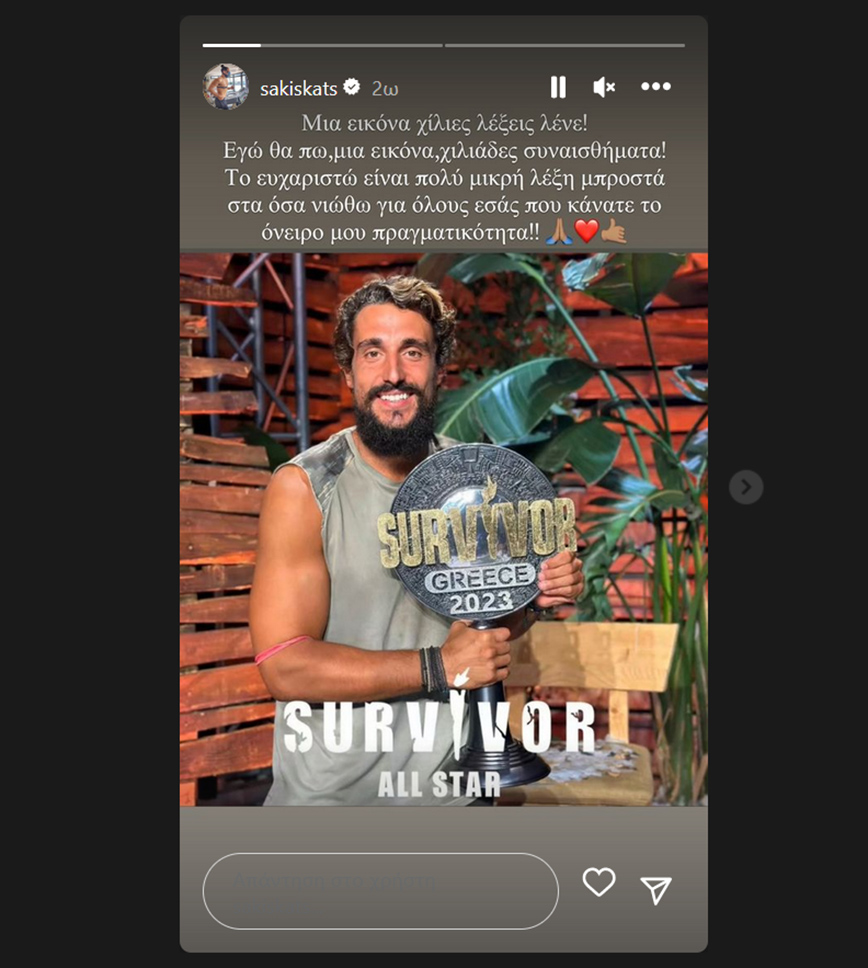 Δημοσιεύοντας μία φωτογραφία στην οποία κρατά το κύπελλο του Survivor All Star ο Σάκης Κατσούλης ευχαρίστησε δημόσια όσους τον στήριξαν στο ριάλιτι επιβίωσης του ΣΚΑΪ και τον ανέδειξαν για δεύτερη φορά νικητή.