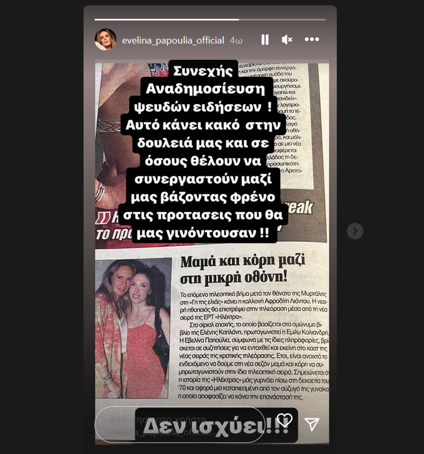 Τη δυσαρέσκειά της σε σχέση με ένα δημοσίευμα που μιλούσε για την ίδια και την κόρη της, Αφροδίτη Λιάντου, εξέφρασε η ηθοποιός Εβελίνα Παπούλια. Με ένα story στον προσωπικό της λογαριασμό στο Instagram, η ηθοποιός ξεκαθάρισε τα όσα ακούγονται γύρω από τα επαγγελματικά της σχέδια.