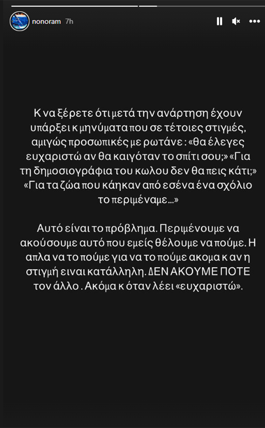 Μετά την πρώτη της ανάρτηση, η Ελεονώρα Μελέτη προχώρησε σε νέα ανάρτηση στο Instagram και τα «έβαλε» με ορισμένους διαδικτυακούς της φίλους που της έστειλαν μηνύματα τύπου: «θα έλεγες ευχαριστώ αν θα καιγόταν το σπίτι σου;».